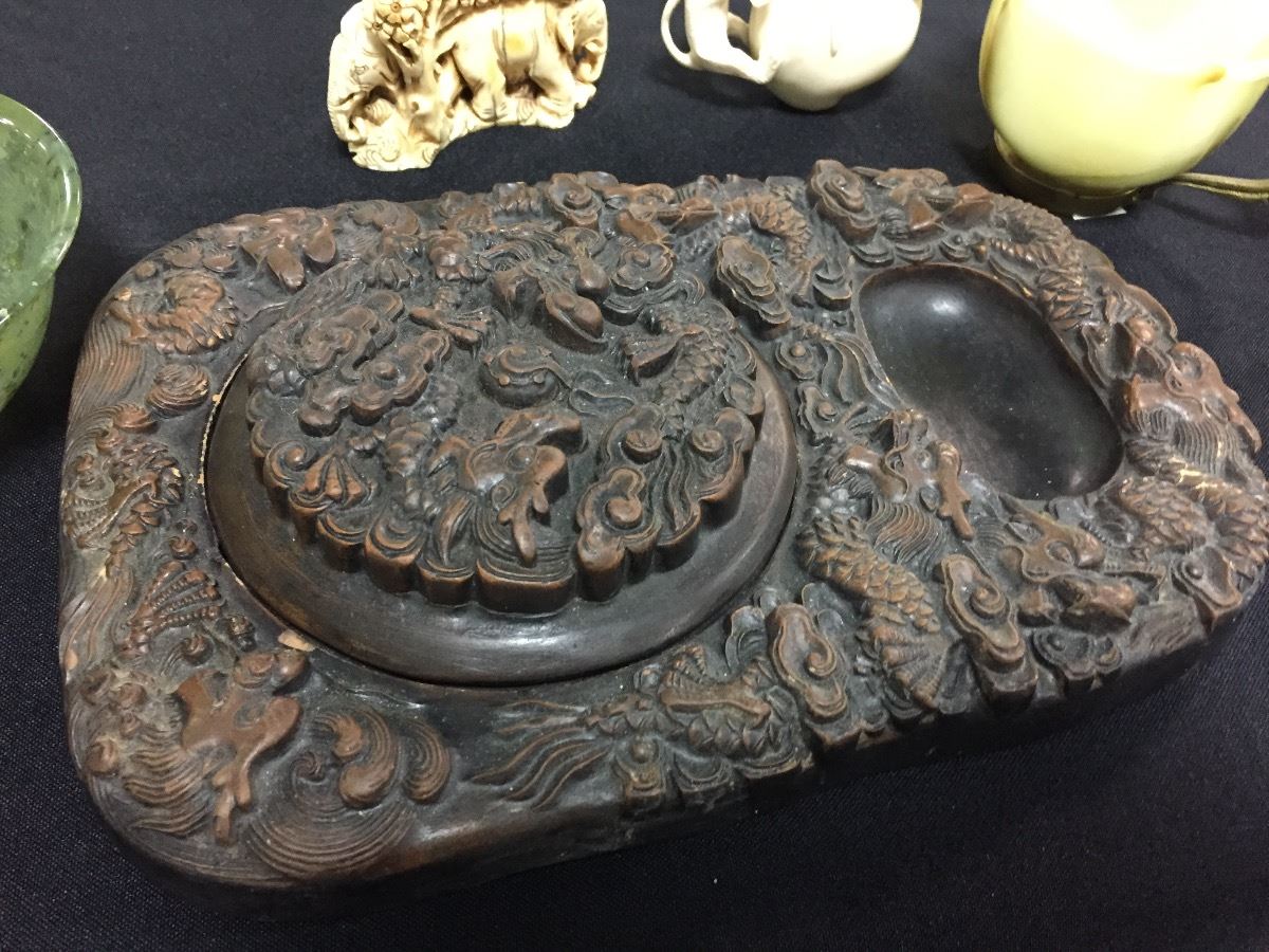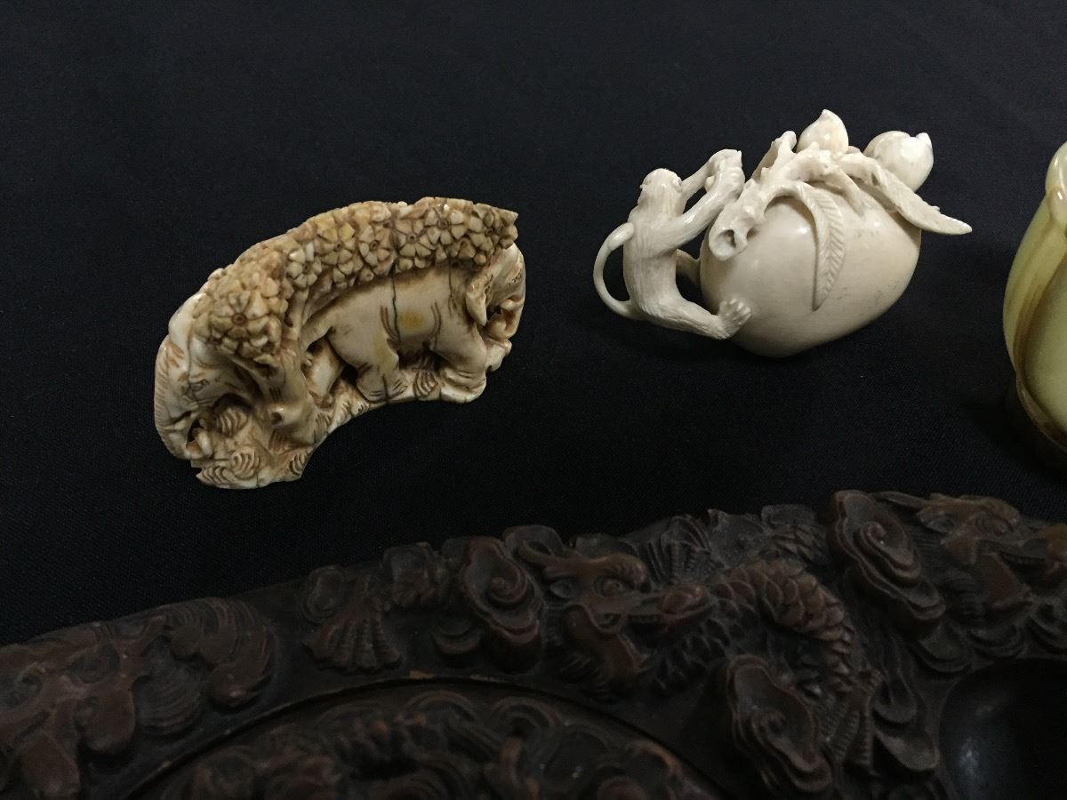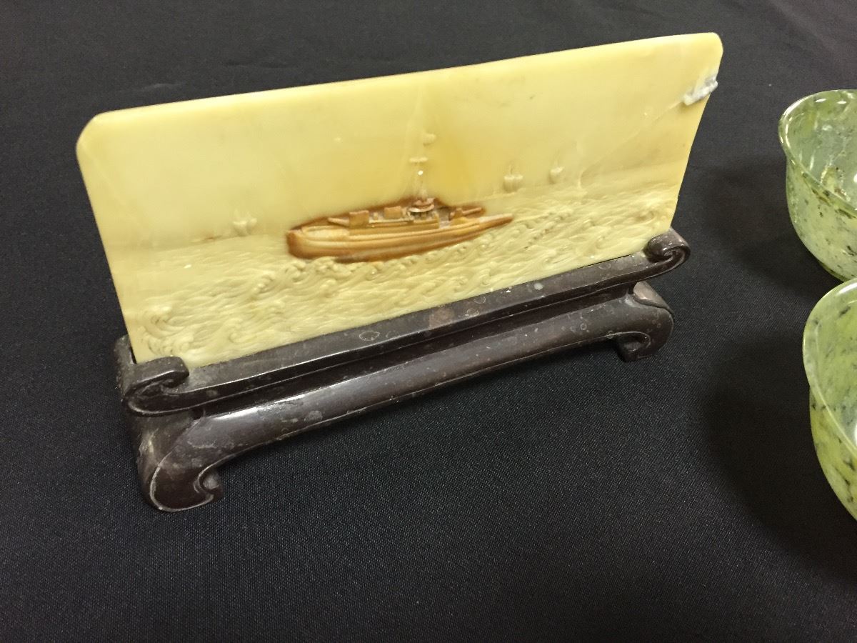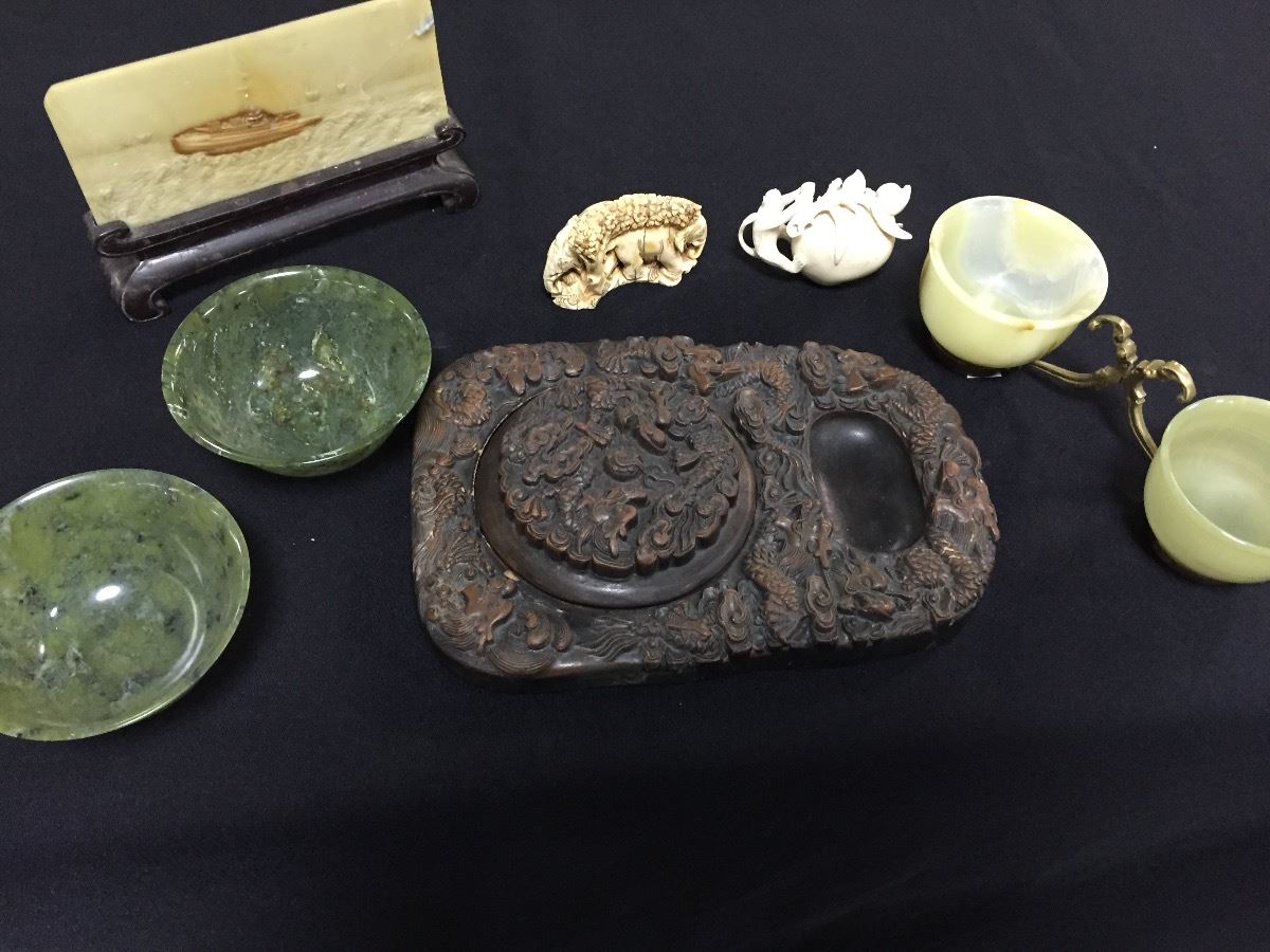 LOT OF ASIAN COLLECTABLES INCLUDING JADE TEA CUPS & IVORY FIGURINES