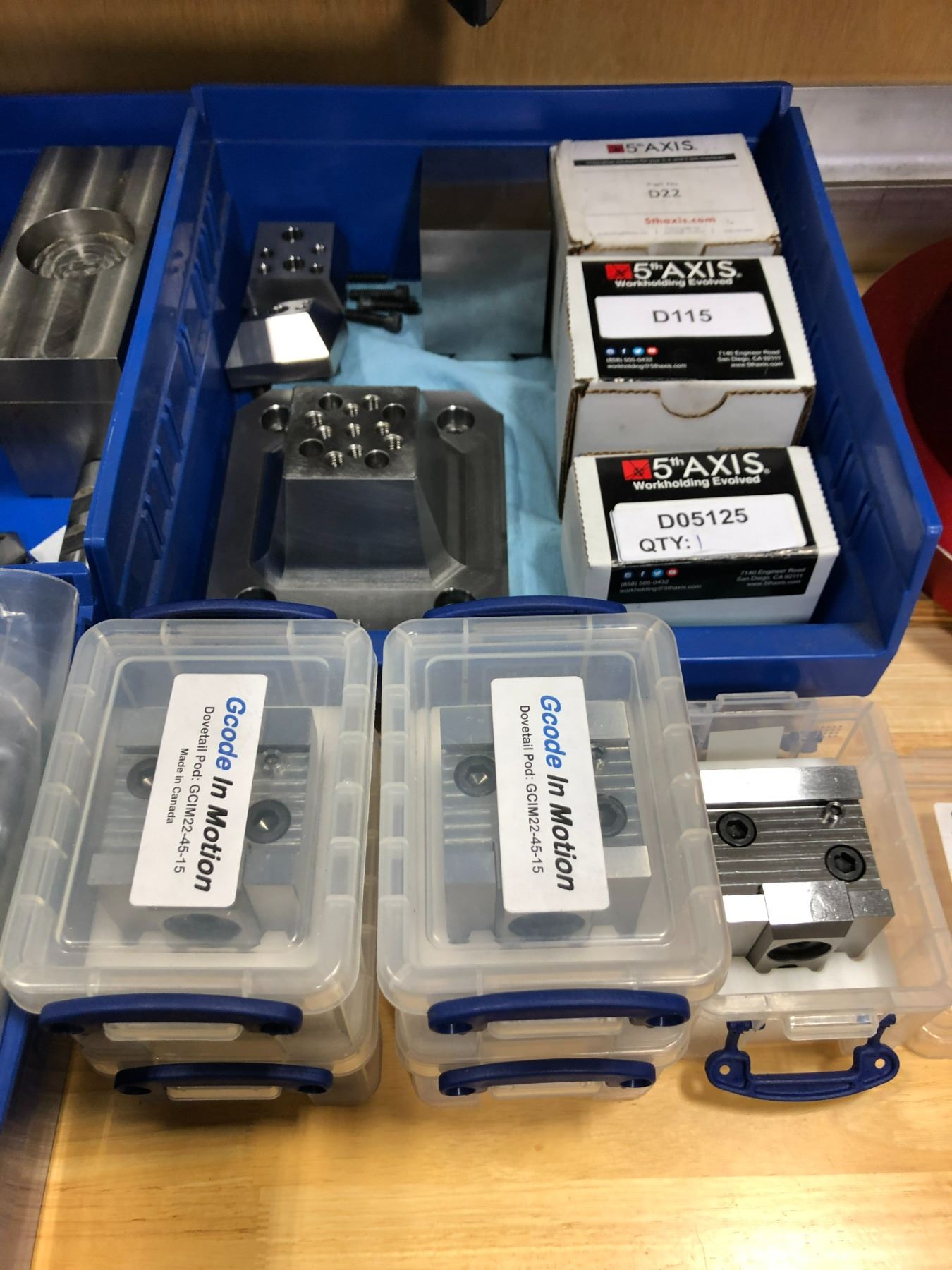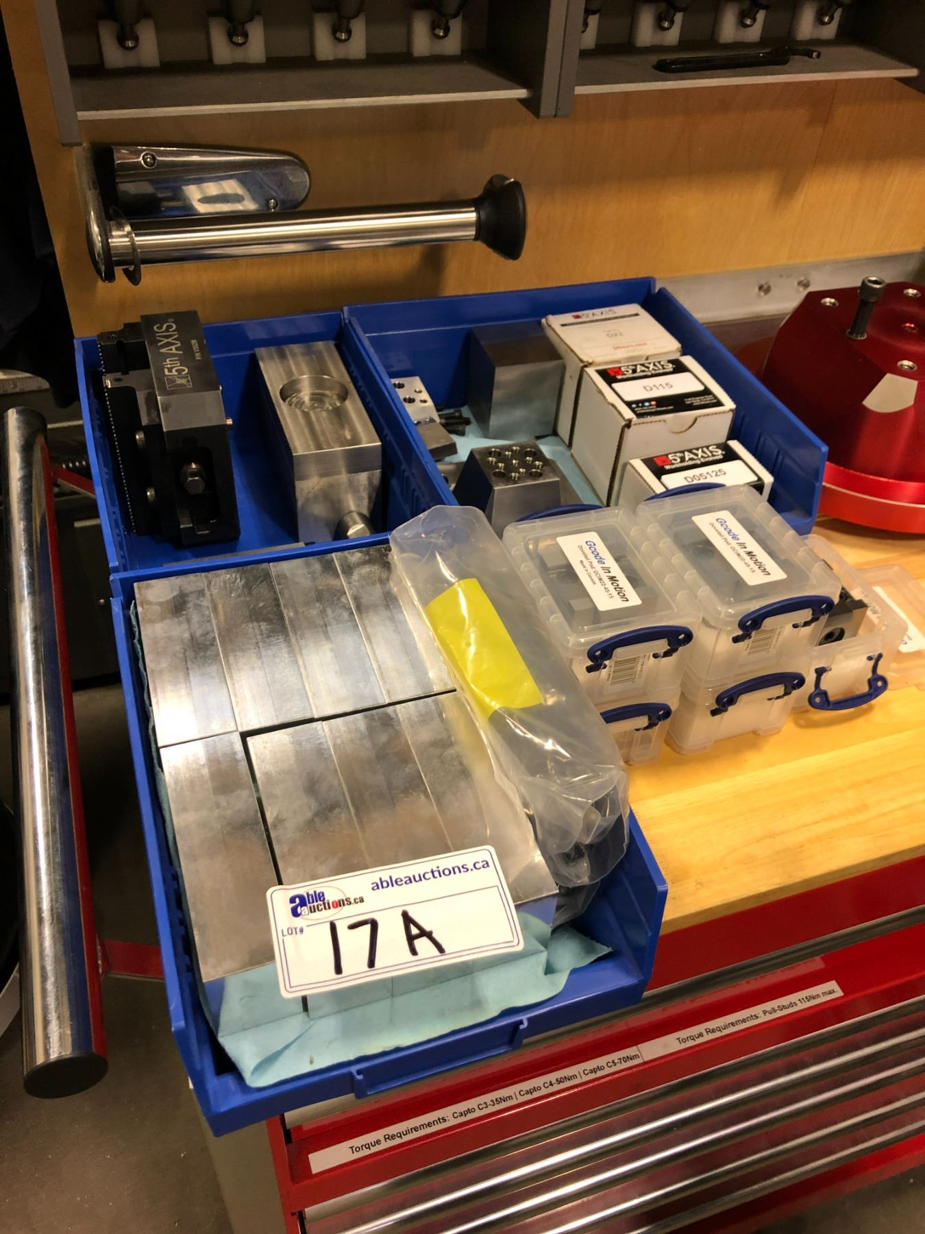 LOT OF ASSORTED 5TH AXIS DOVE TALE VICES, SELF CENTERING VICE WITH CUSTOM JAW PLATES, SOFT JAWS 5TH AXIS SELF CENTERING VICE RISER AND 4 CUSTOM 2" DOVE TALE VICES