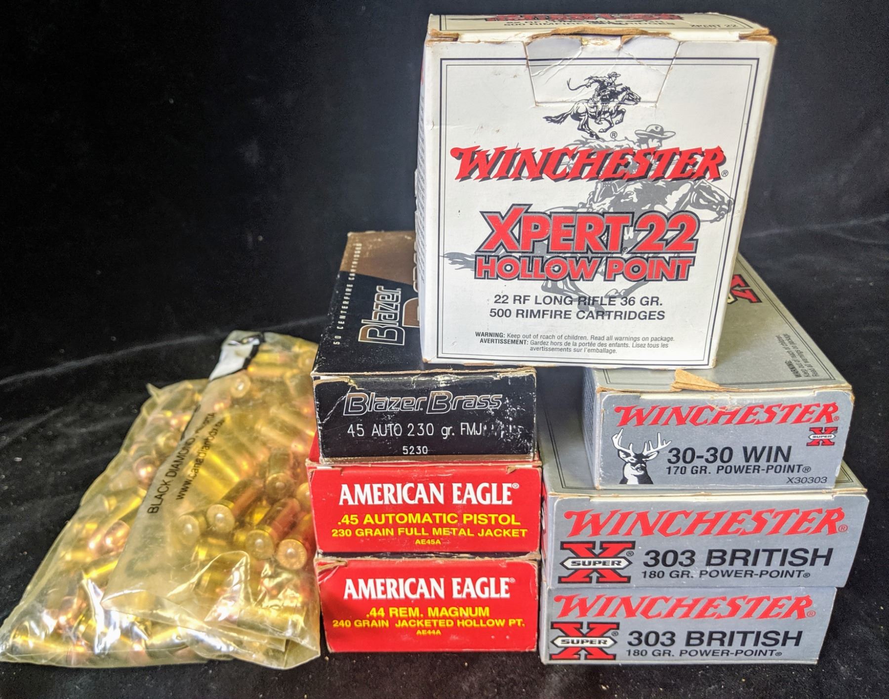 LOT OF ASSORTED AMMUNITION INCLUDING .45 AUTO (BAGS), .44 REM. MAGNUM, .22 LONG RIFLE, 303 BRITISH
