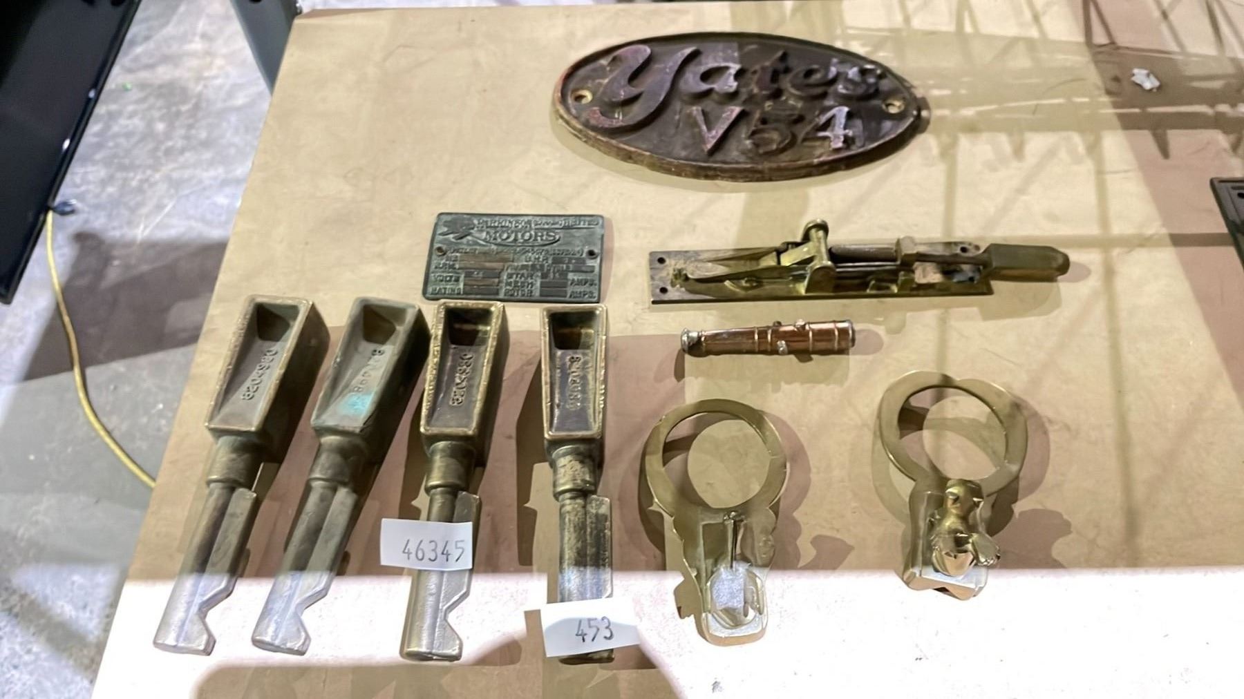 LOT OF ASSORTED ANTIQUE BRASS HANDLES, DOOR KNOCKERS, INFO PLATE & MORE
