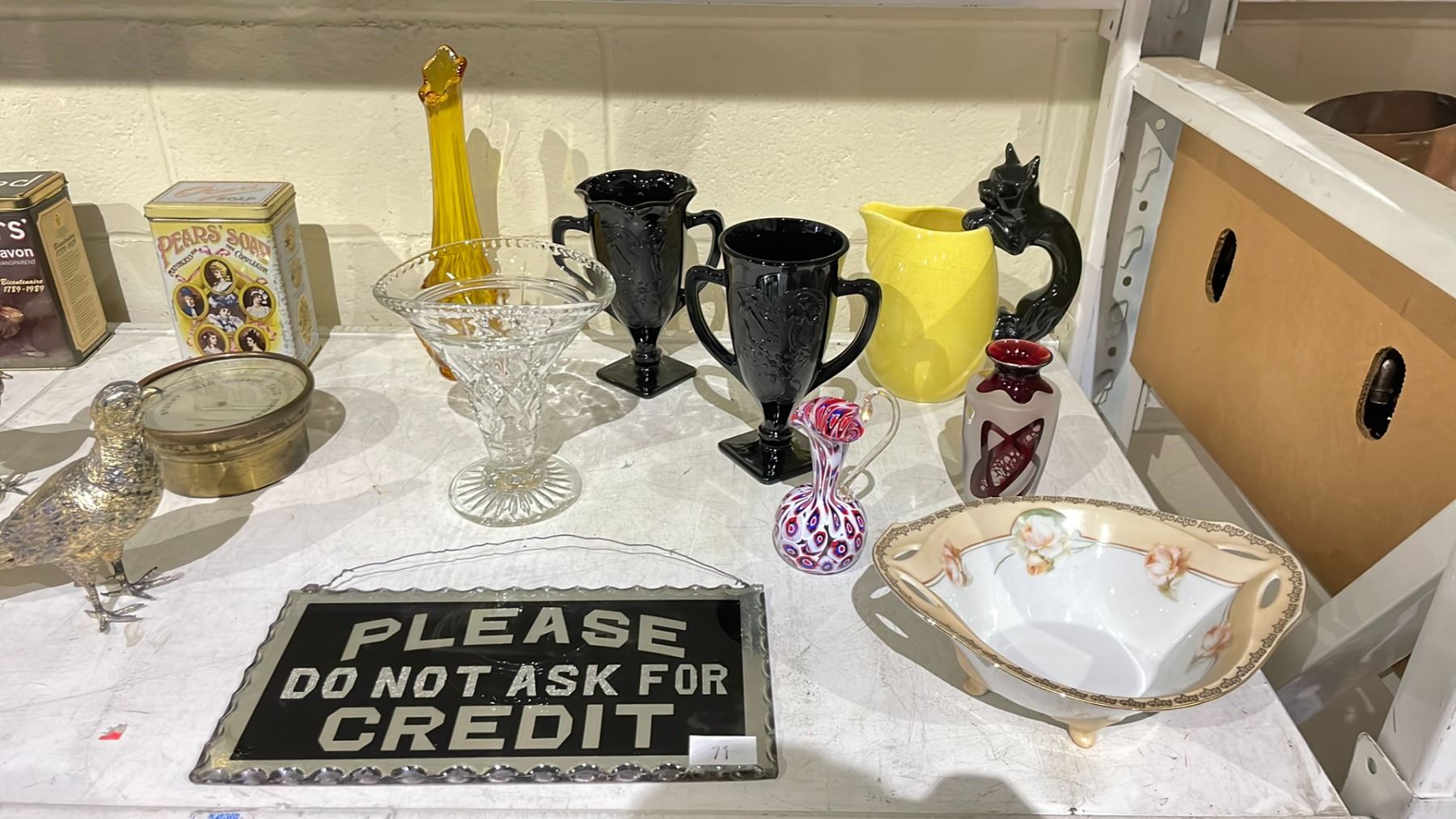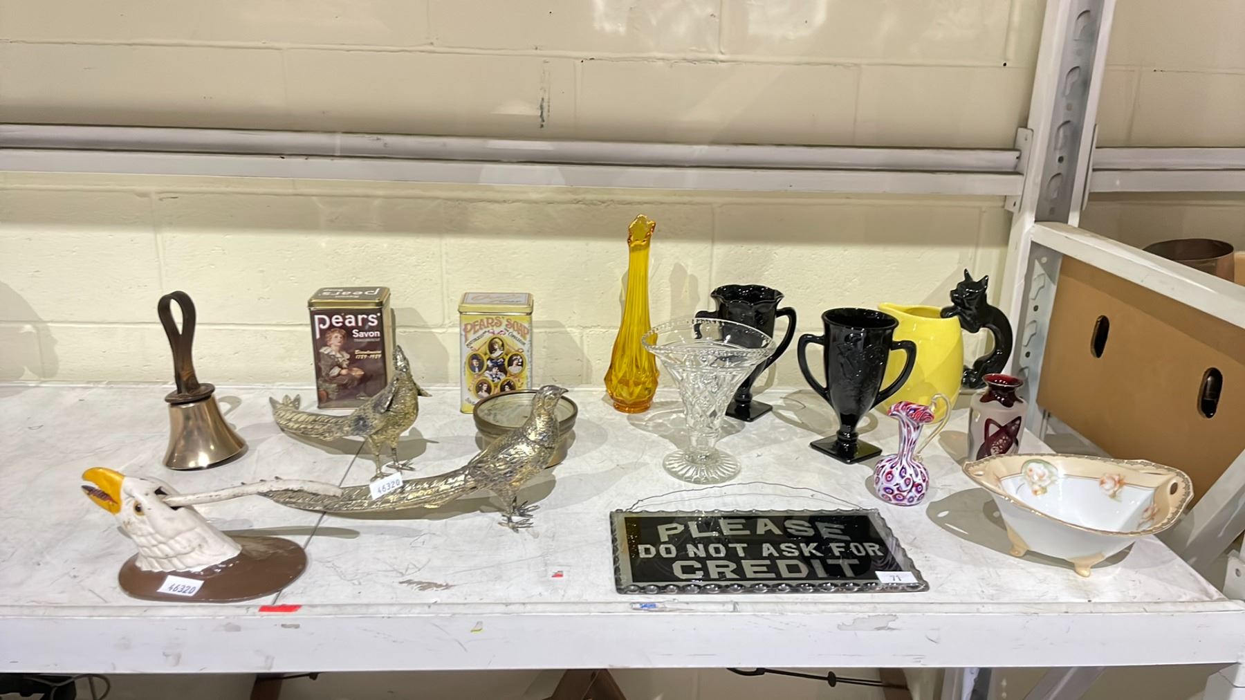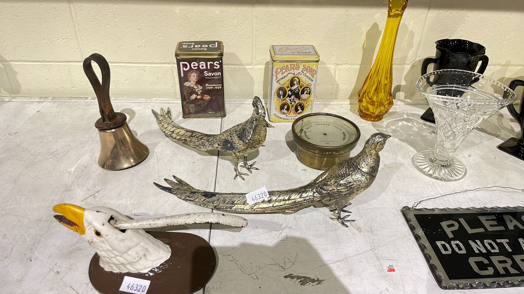 LOT OF ASSORTED ANTIQUES INCLUDING; EAGLE NUTCRACKER, PEARS TINS, VASES & MORE