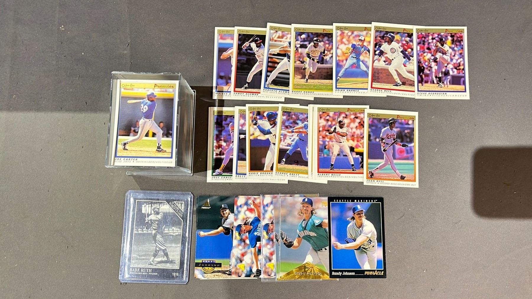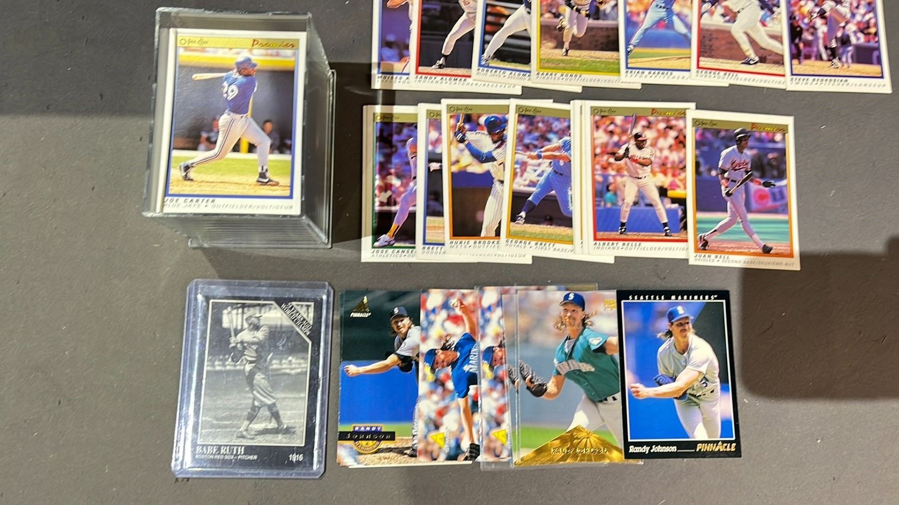 LOT OF ASSORTED BASEBALL CARDS INCLUDING; BABE RUTH, RANDY JOHNSON, BARRY BONDS & MORE
