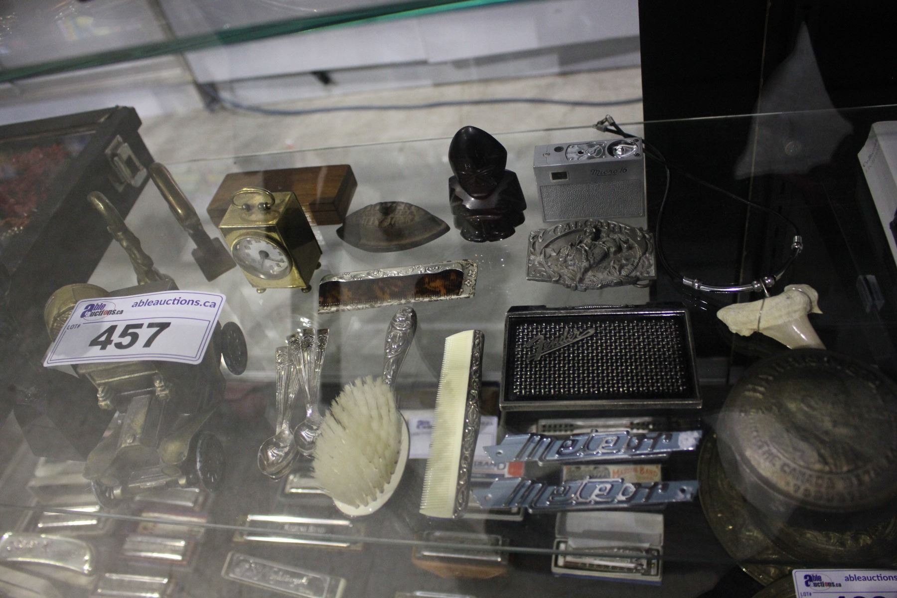 LOT OF ASSORTED COLLECTABLES INCLUDING ANTIQUE BRUSH SET, PAPER WEIGHTS, AND MORE