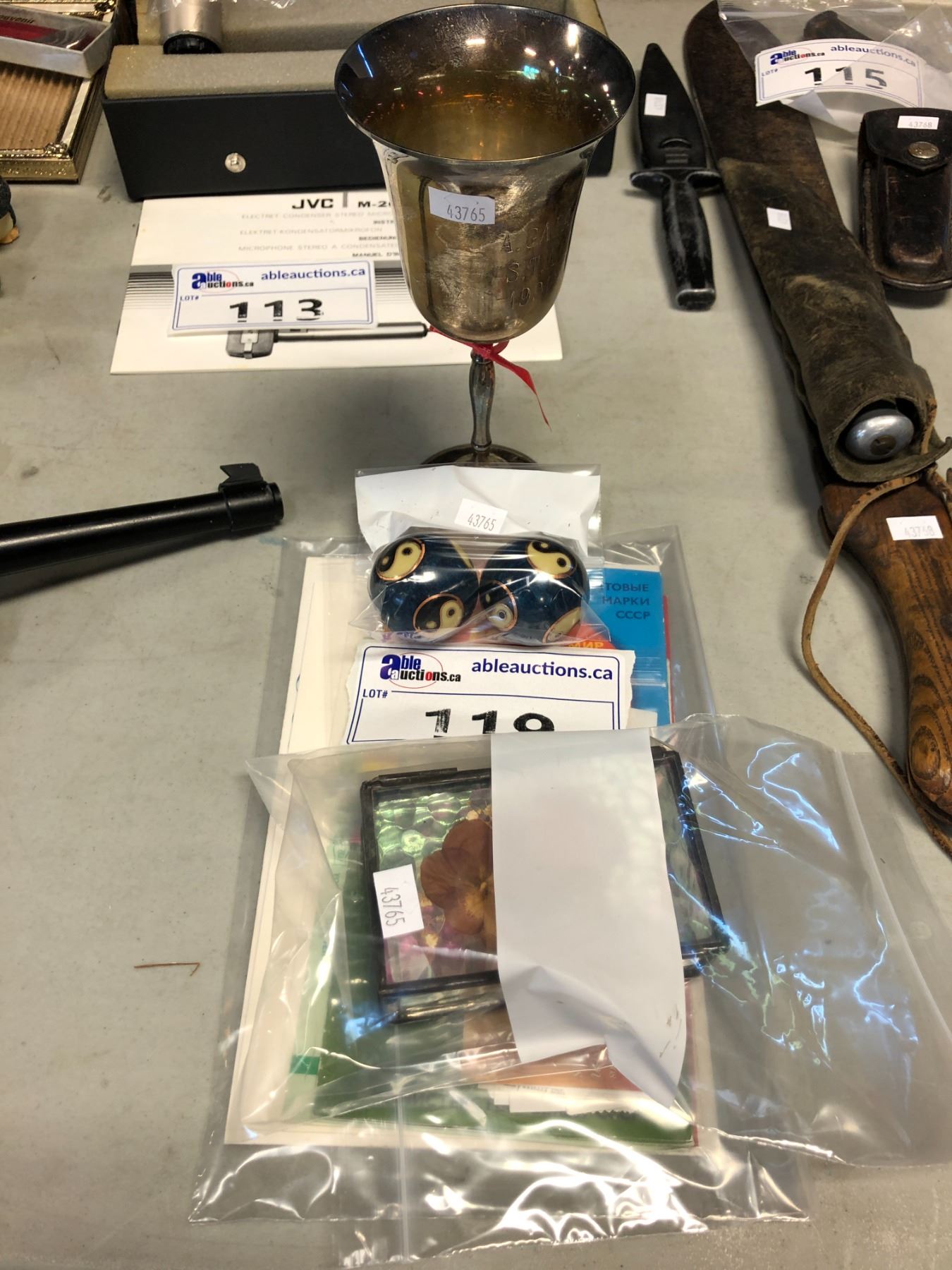 LOT OF ASSORTED COLLECTIBLE STAMPS, CHINESE BAODING BALLS BALLS, JEWELRY BOX, AND BRASS GOBLET