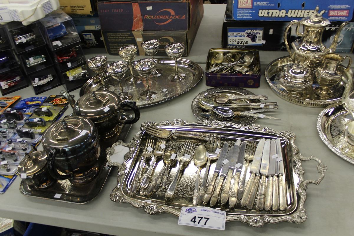 LOT OF ASSORTED CUPS, PLATTERS, CUTLERY & TEA SET