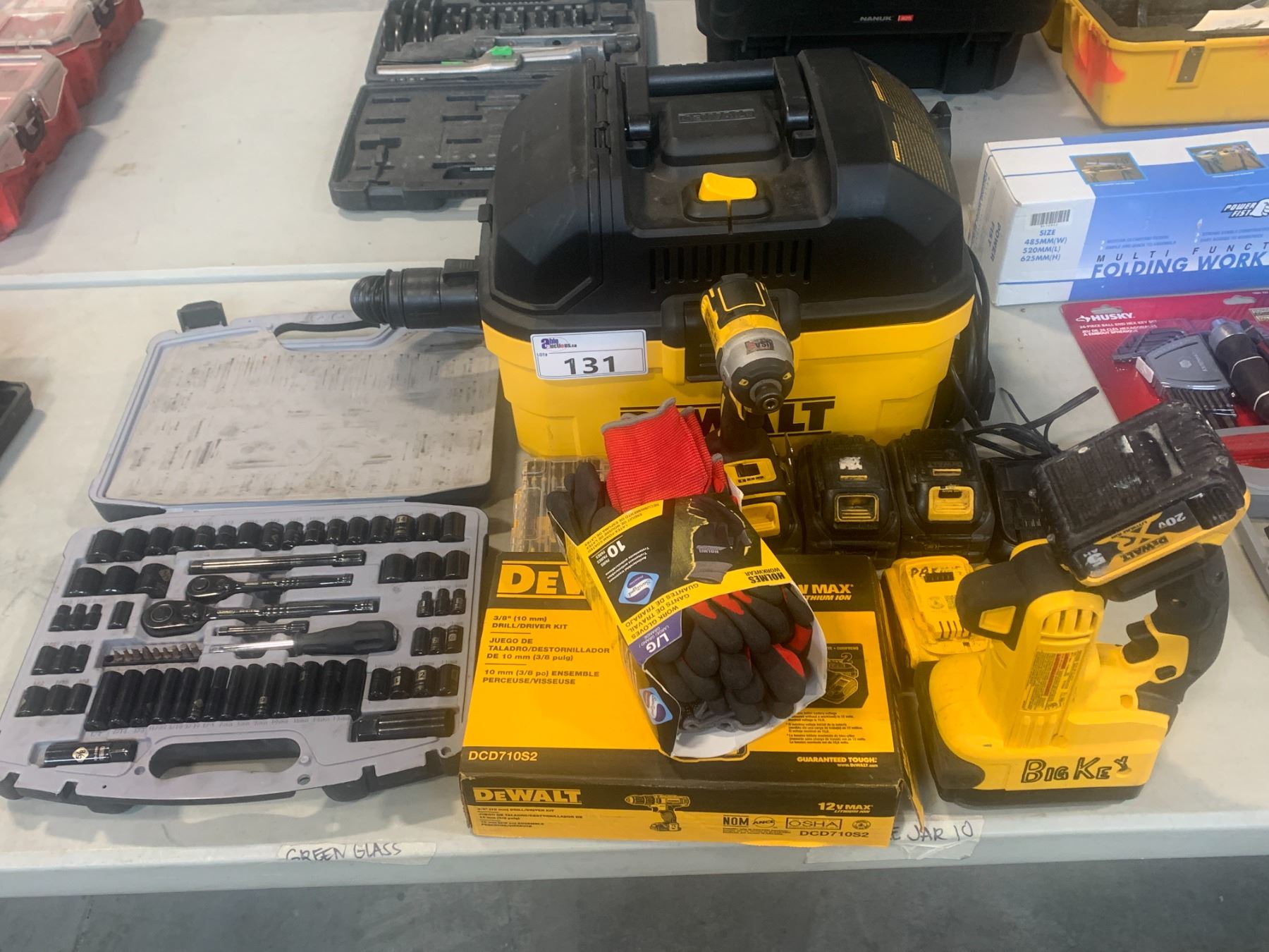 LOT OF ASSORTED DEWALT POWER TOOLS INCLUDING WET/DRY VACUUM, DCD710S2 DRILL/DRIVER KIT, BATTERIES,
