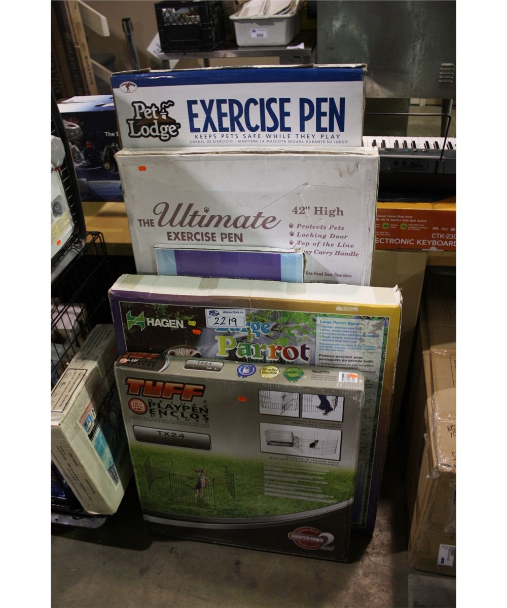 LOT OF ASSORTED DOG CAGES AND BIRD STANDS