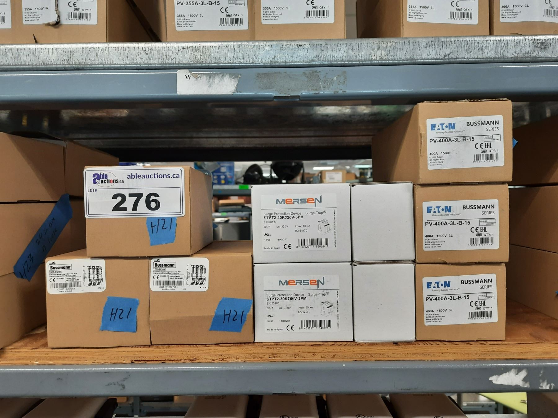 LOT OF ASSORTED ELECTRICAL COMPONENTS INCLUDING FUSES, FUSE COVER KITS, AND SURGE TRAPS