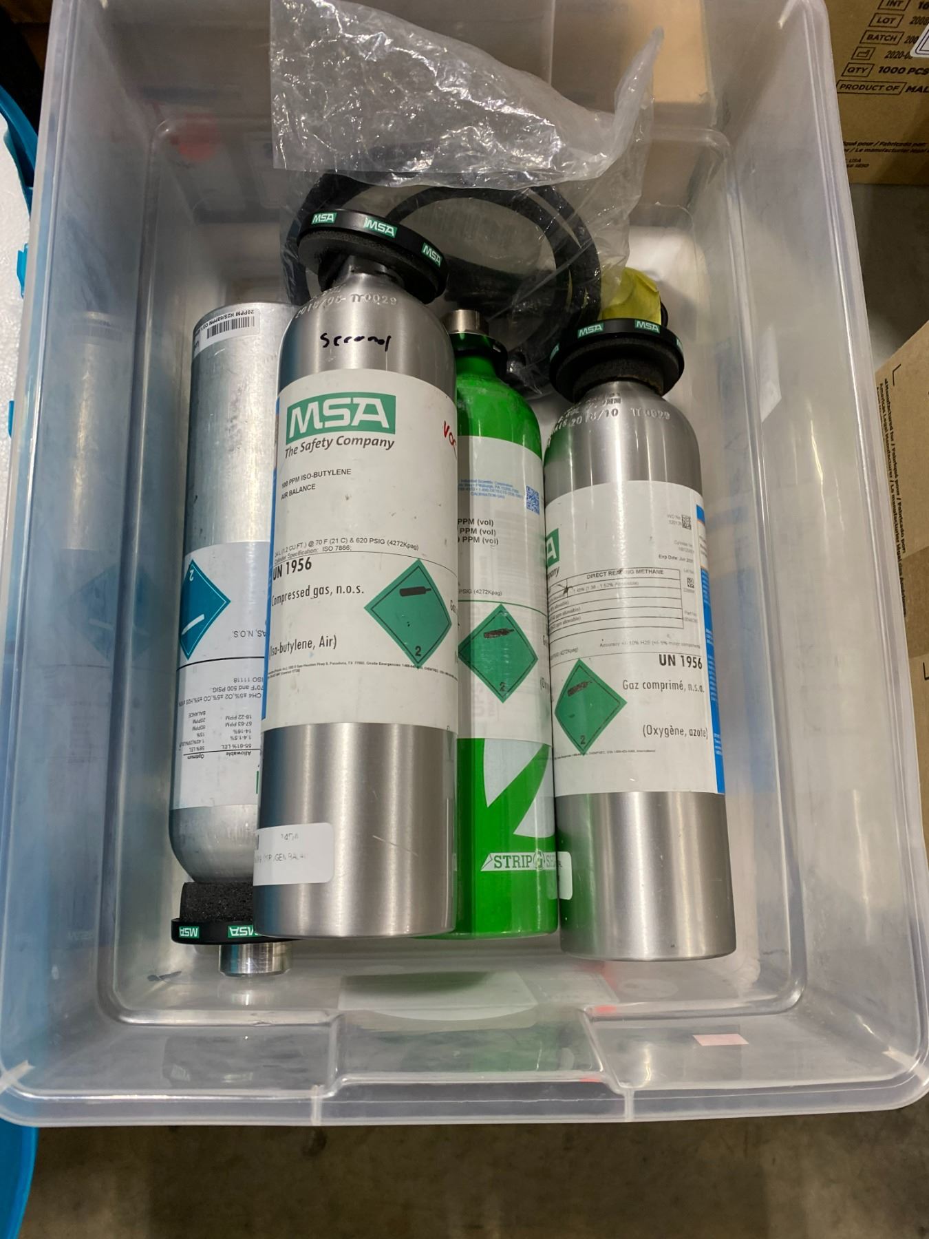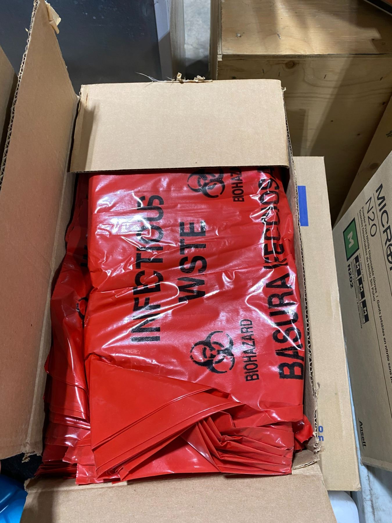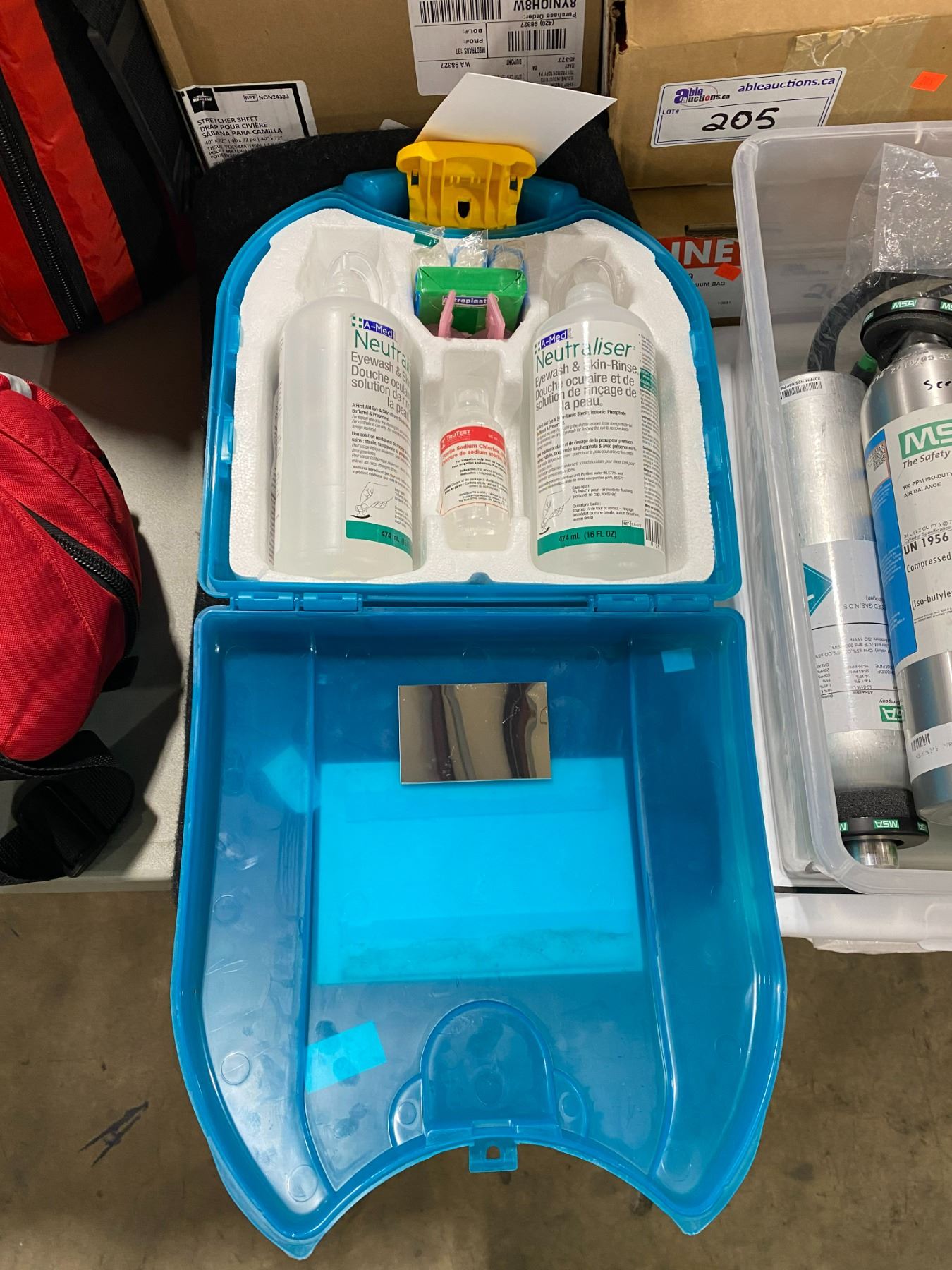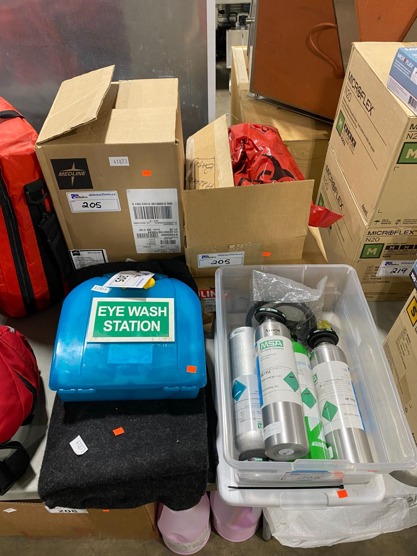 LOT OF ASSORTED FIRST AID SUPPLIES INCLUDING PORTABLE EYE WASH STATION, WOOL BLANKET, DISPOSABLE STRETCHER SHEETS, BIO HAZARD BAGS, BOX OF VACUUM BAGS, & 4 ASSORTED EMPTY COMPRESSED GAS CANISTERS