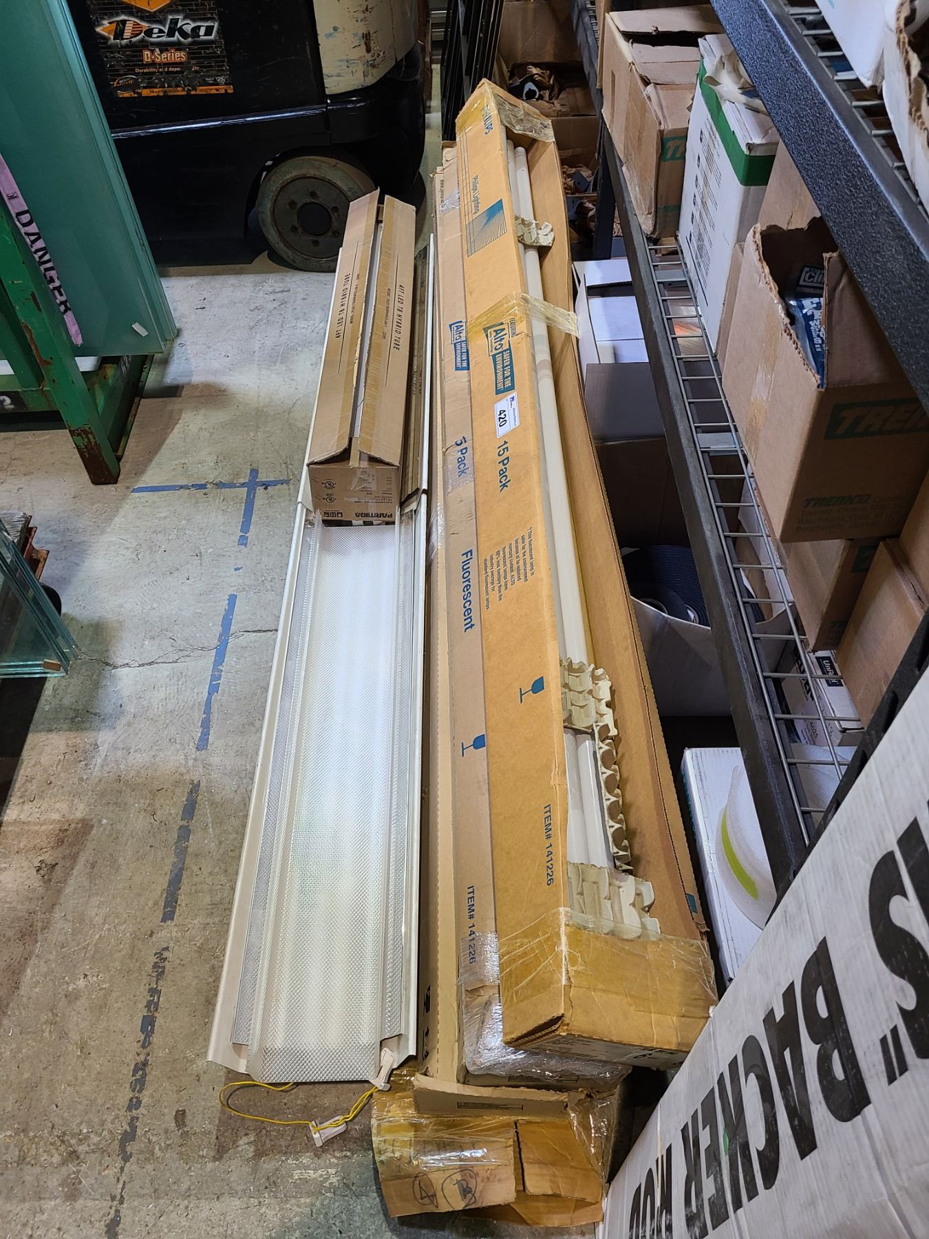 LOT OF ASSORTED FLUORESCES AND LED TUBE LIGHTBULBS WITH HOUSING