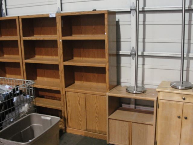 LOT OF ASSORTED FURNITURE; 3PC SHELF UNIT, MICROWAVE STAND, SMALL CABINET TABLE AND 2 FLOOR LAMPS