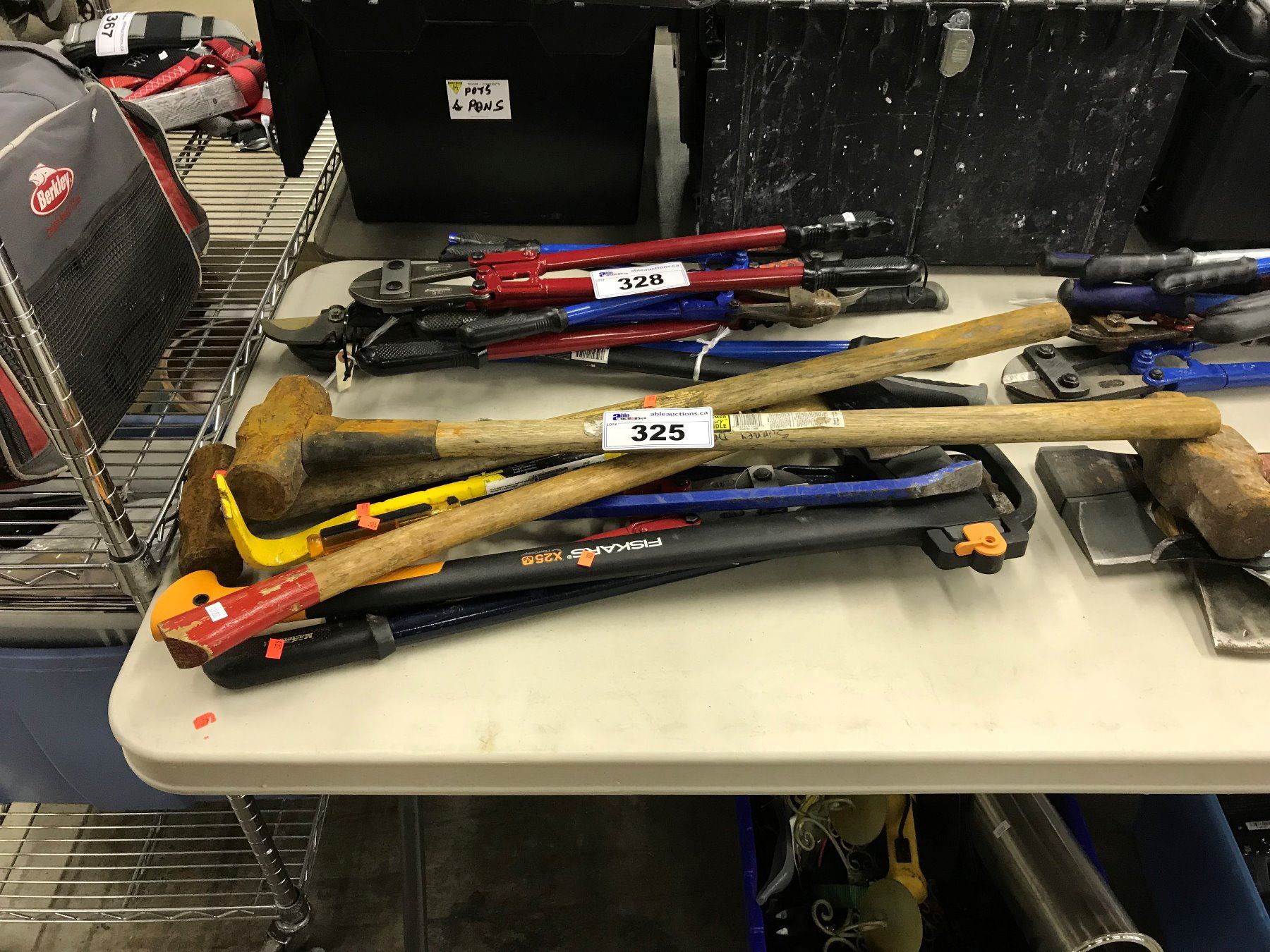 LOT OF ASSORTED HAND TOOLS: AXES, SLEDGE HAMMERS