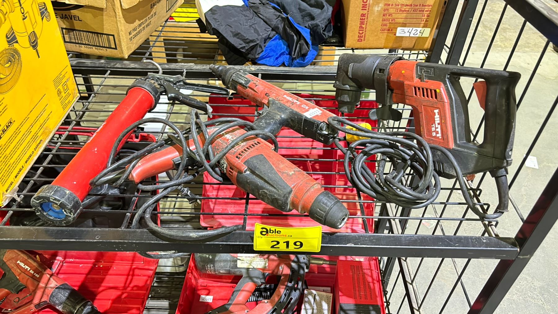 LOT OF ASSORTED HILTI TOOLS INCLUDING; TE5 RIGHT ANGLE DRILL, TE2 CONCRETE DRILL, DX 36 M FASTENER & CAULKING GUN