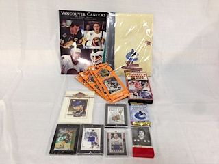 LOT OF ASSORTED HOCKEY ITEMS INCLUDING CANUCK YEARBOOK, WAYNE GRETZKY COLLECTOR PINS, ASSORTED FRAMED CARDS & OTHER ITEMS