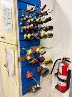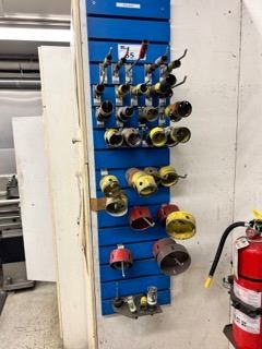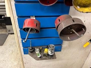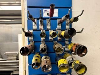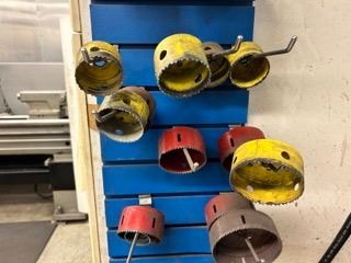 LOT OF ASSORTED HOLE SAWS AND WALL MOUNTED HOLE SAW RACK