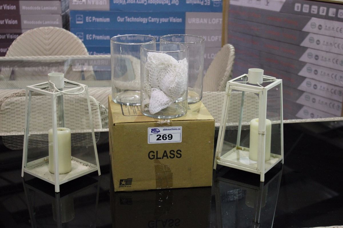 LOT OF ASSORTED HURRICANE VASES, LANTERNS & HOUSEHOLD ITEMS