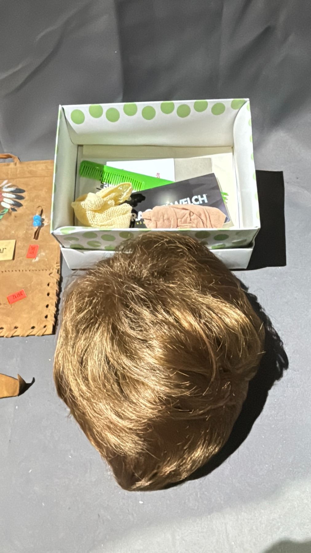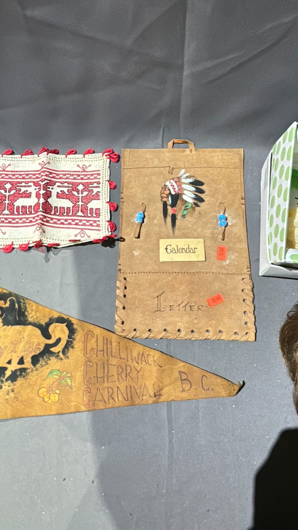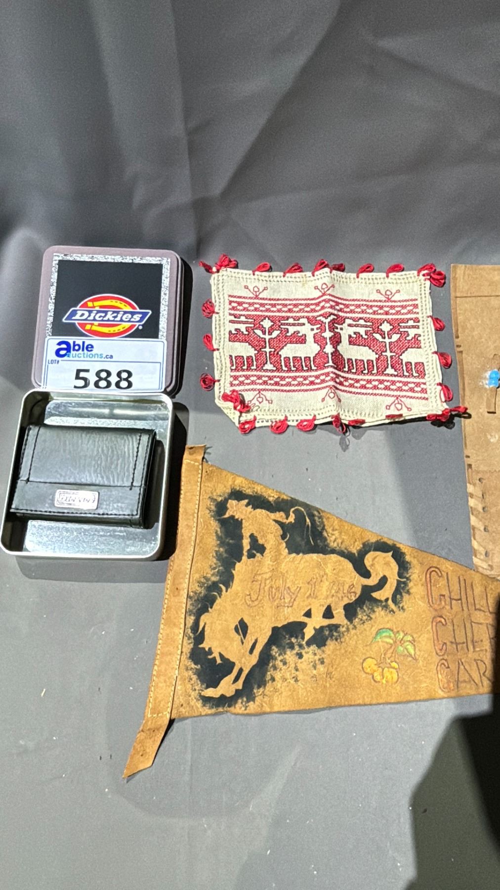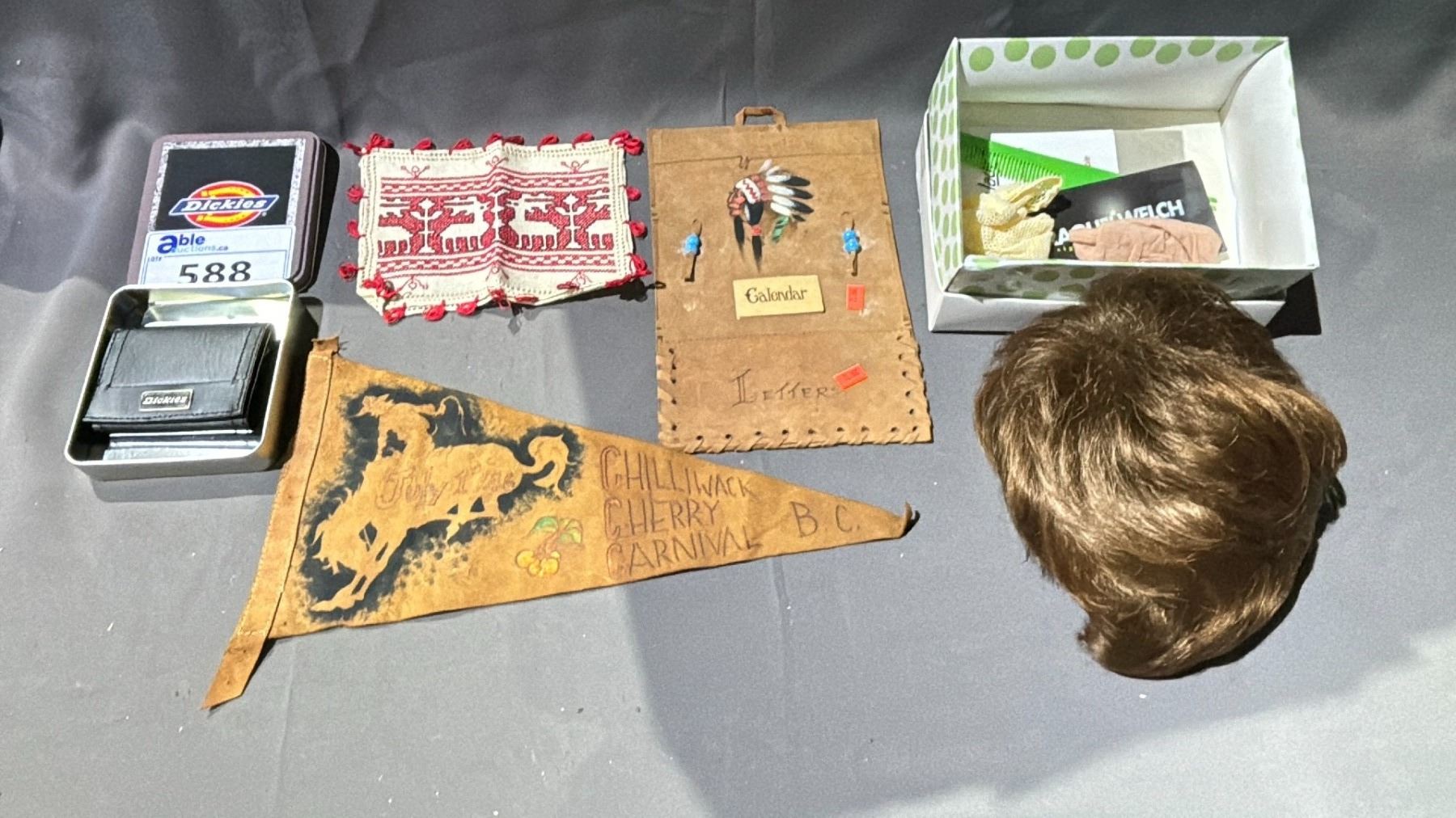 LOT OF ASSORTED ITEMS INCLUDING; DICKIES WALLET, WIG, FIRST NATIONS LEATHER PENNANT & MORE