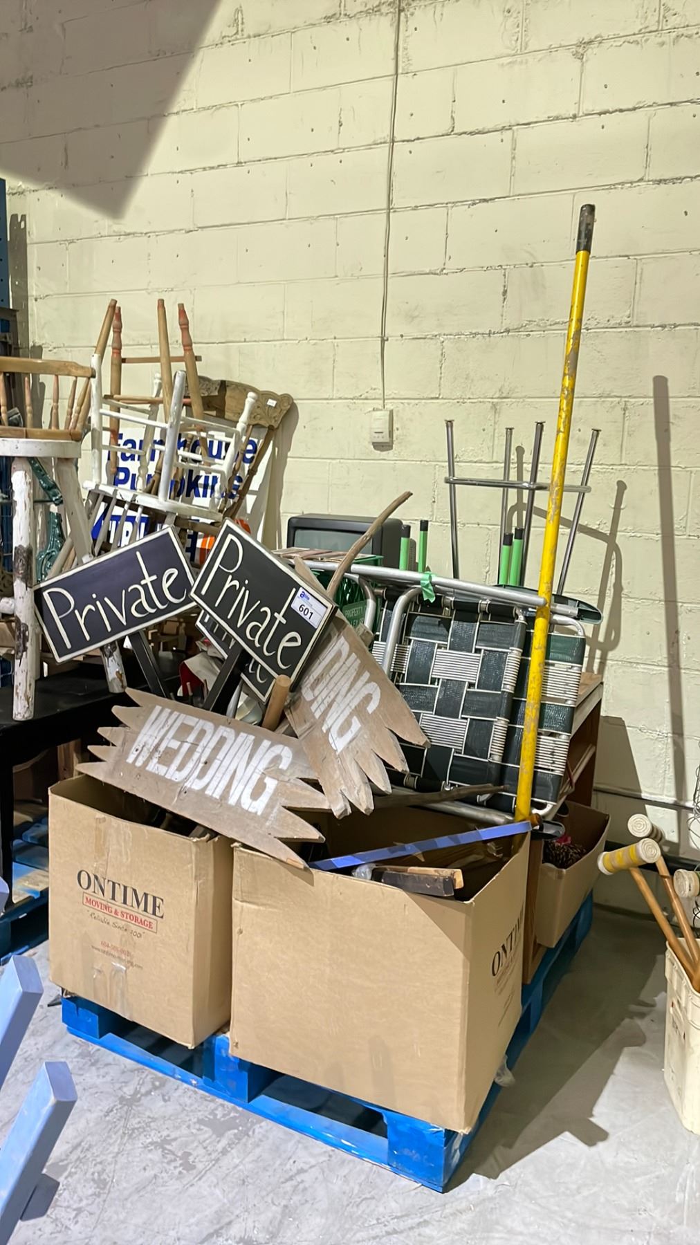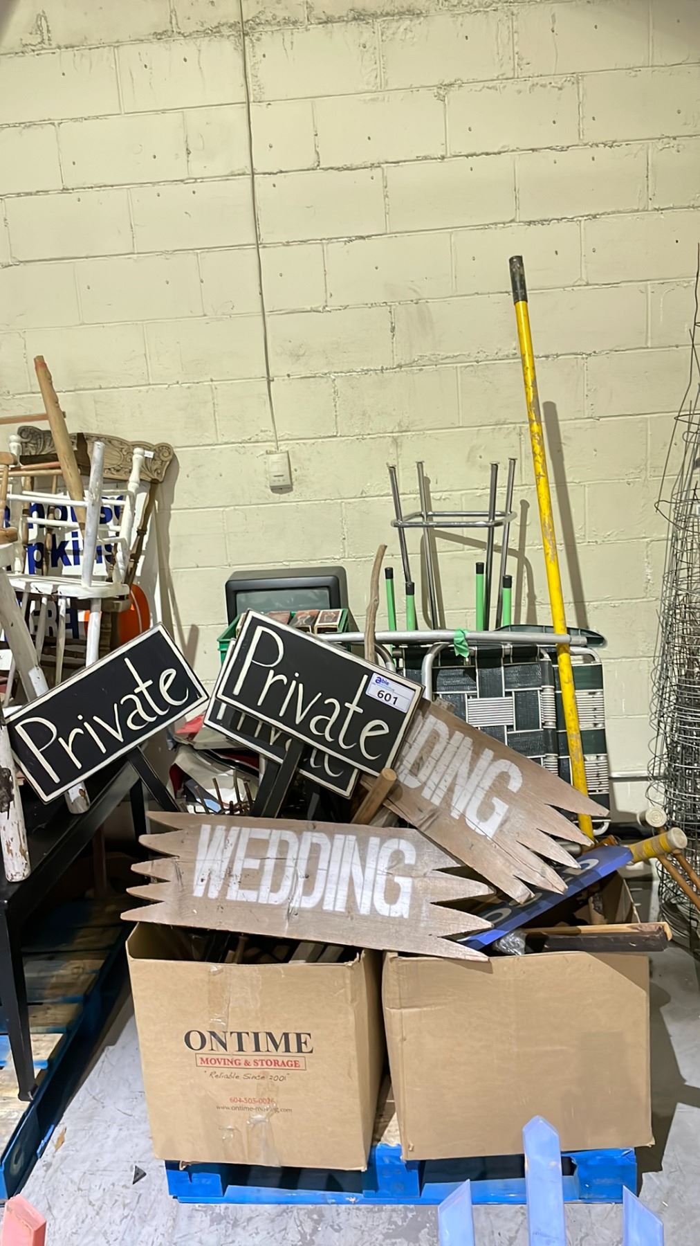 LOT OF ASSORTED ITEMS INCLUDING; EVENT SIGNS, VINTAGE TV, FURNITURE & MORE