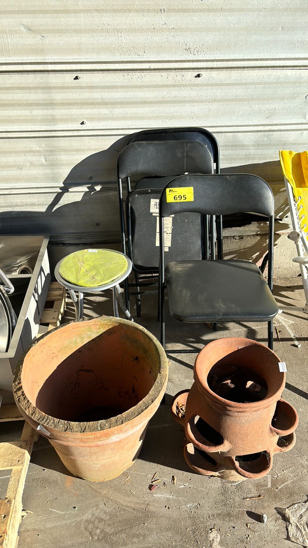 LOT OF ASSORTED ITEMS INCLUDING; FOLDING CHAIRS, FOLDING STOOL & 2 PLANTER POTS