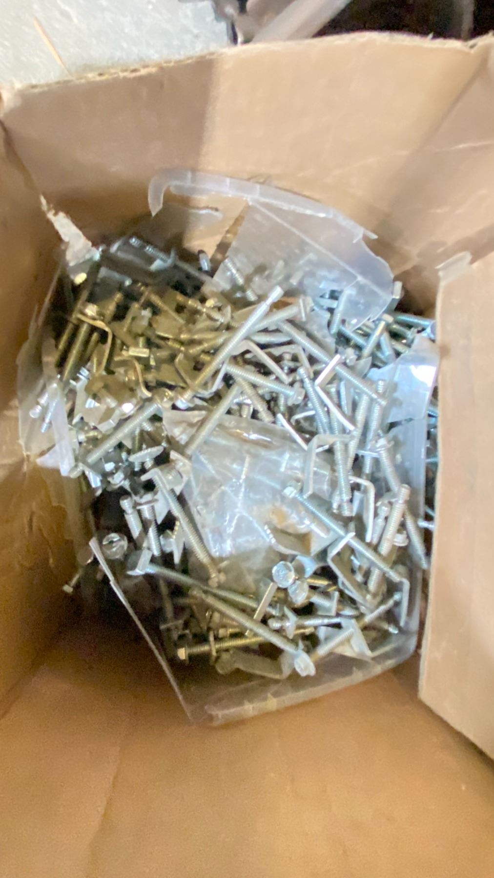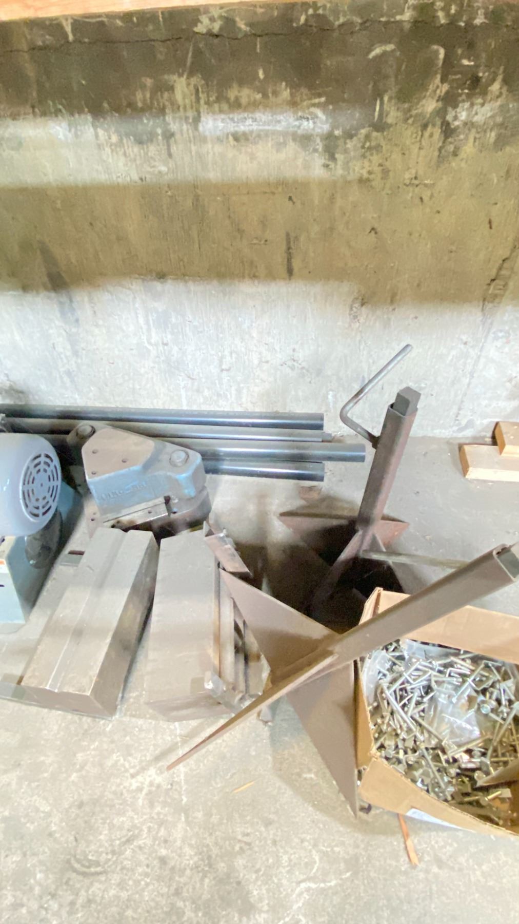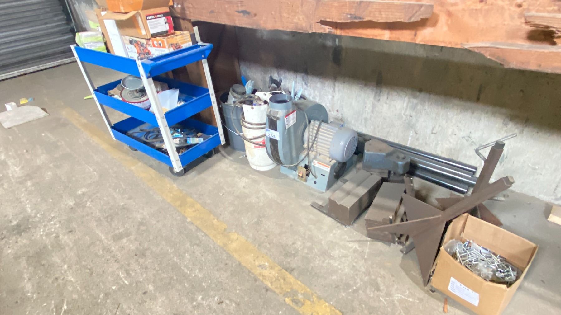 LOT OF ASSORTED ITEMS INCLUDING METAL STANDS, SCRAP METAL, MOBILE CART WITH CONTENTS, BLOWER MOTOR,