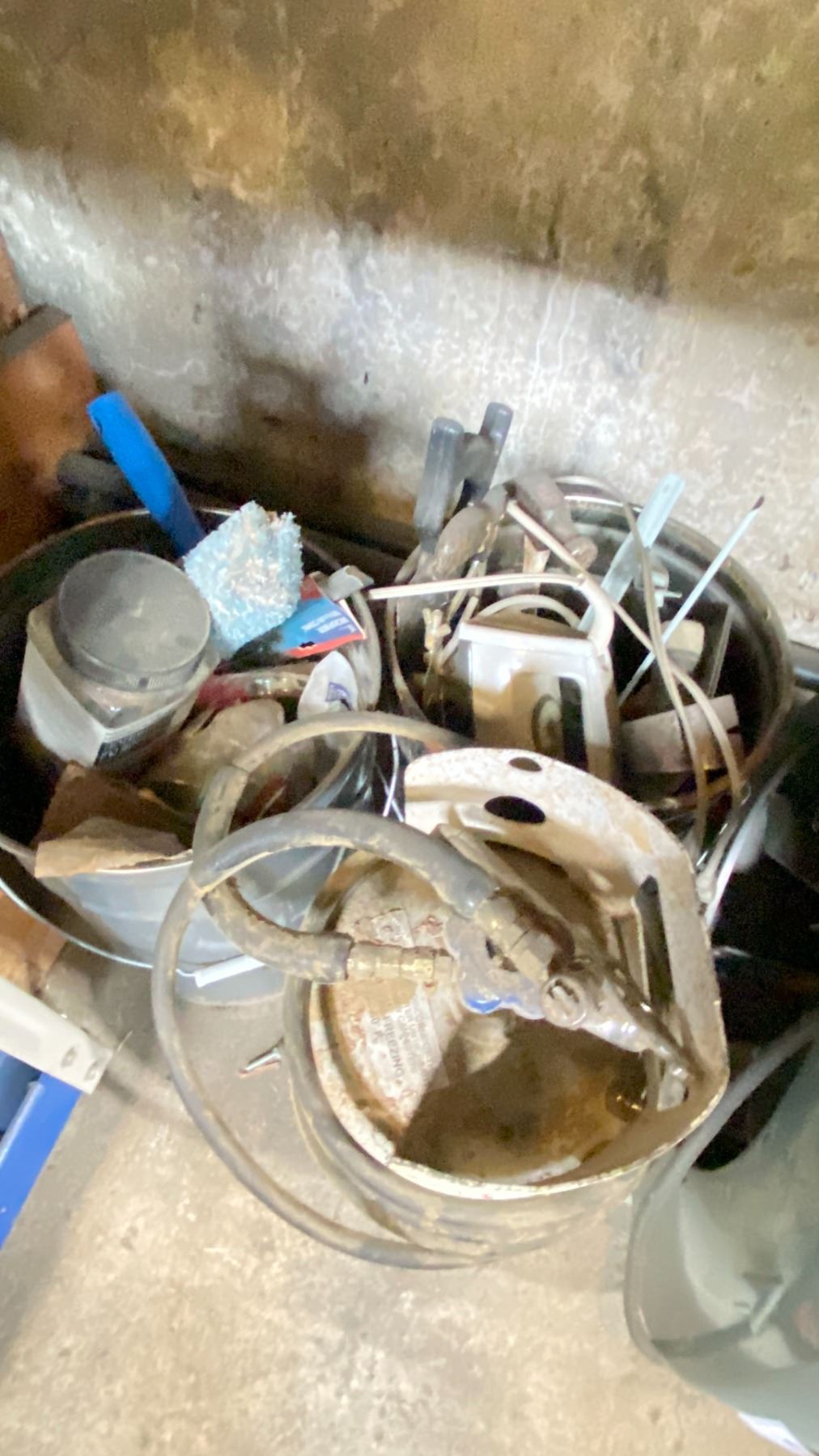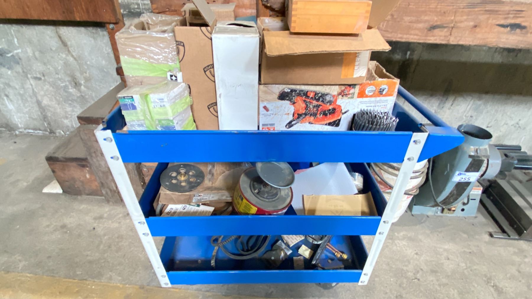 LOT OF ASSORTED ITEMS INCLUDING METAL STANDS, SCRAP METAL, MOBILE CART WITH CONTENTS, BLOWER MOTOR, MISC TOOLS & MORE