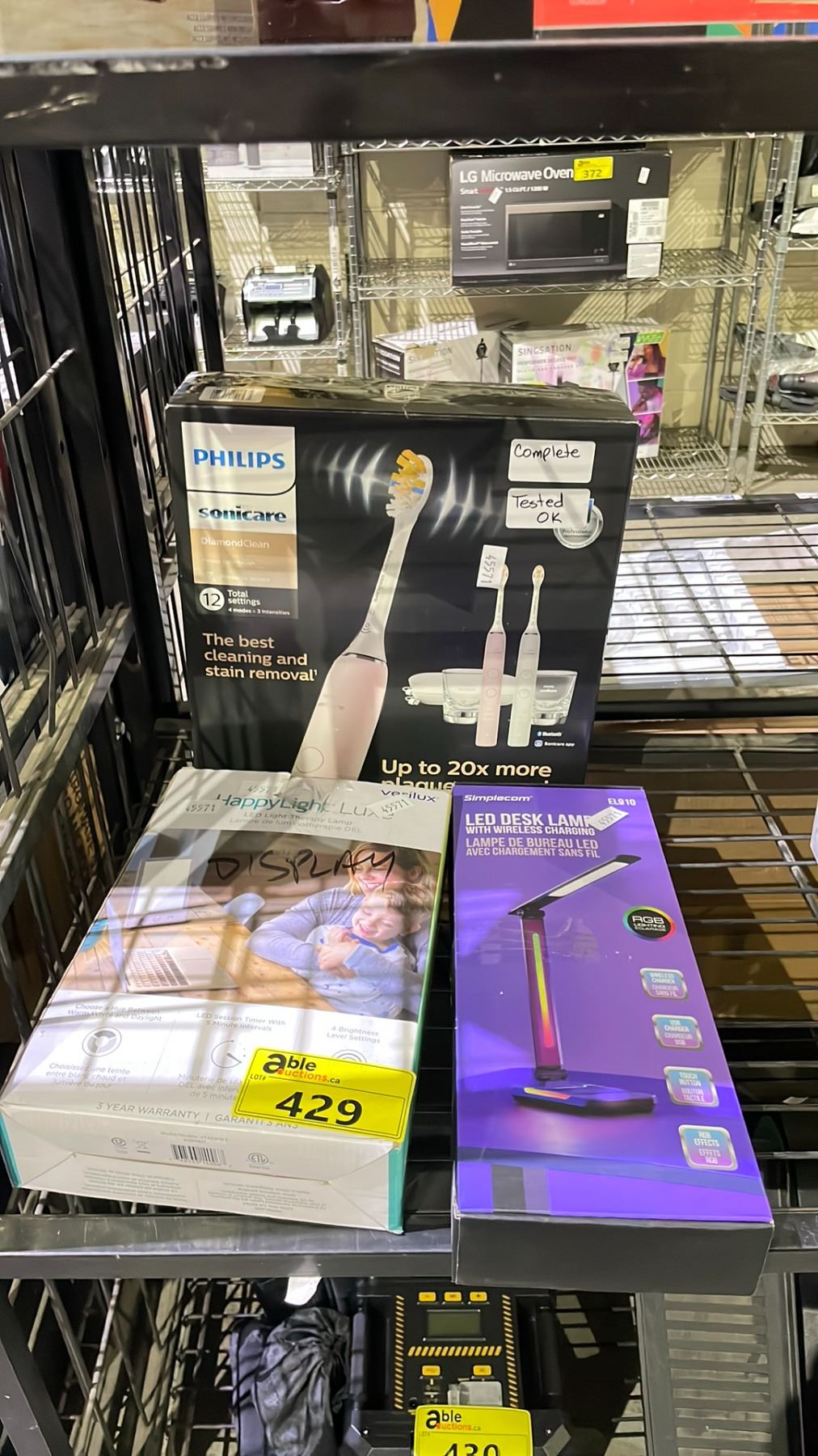 LOT OF ASSORTED ITEMS INCLUDING; PHILIPS SONICARE TOOTHBRUSH, LED DESK LAMP & LED LIGHT THERAPY LAMP (UNKNOWN WORKING CONDITION, MAY BE MISSING PIECES)