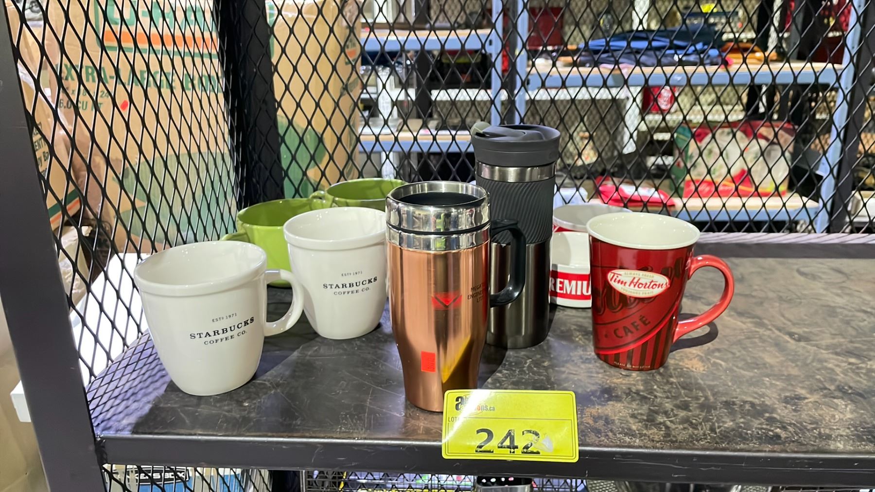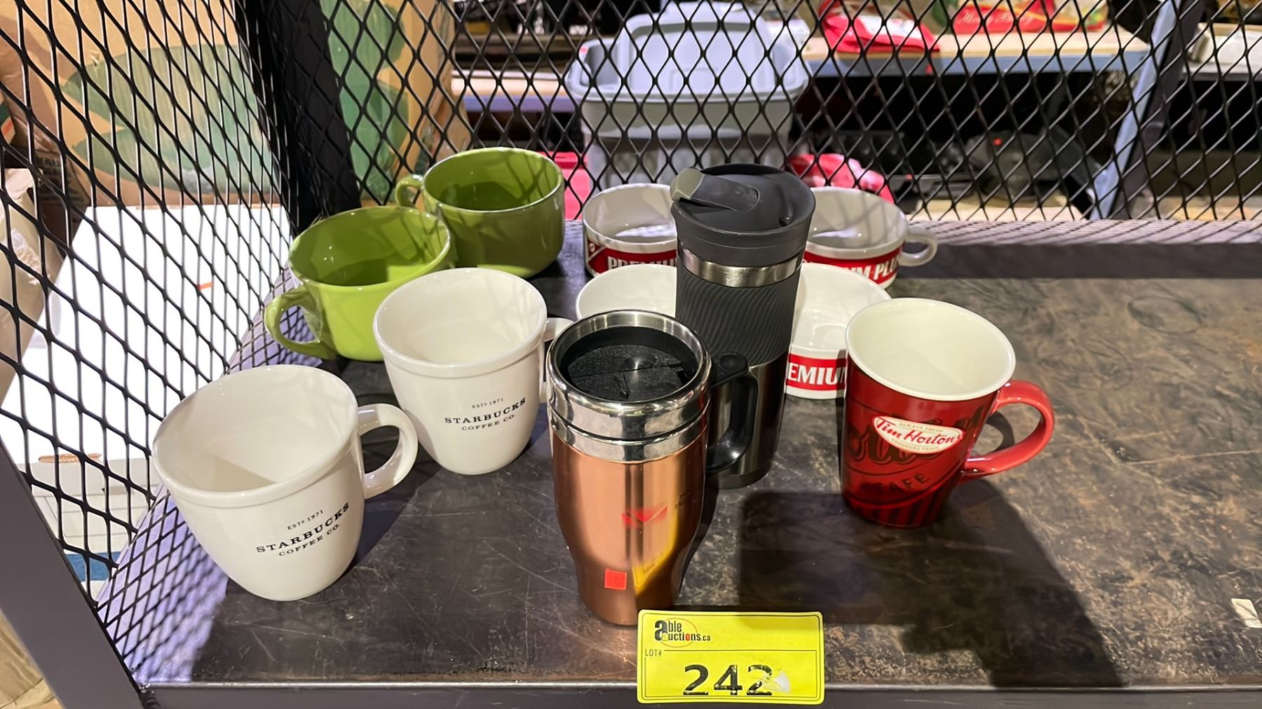 LOT OF ASSORTED ITEMS INCLUDING; STARBUCKS MUGS, PREMIUM PLUS SOUP BOWLS, TIM HORTONS MUG & MORE