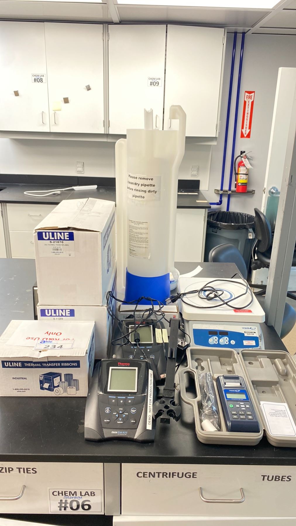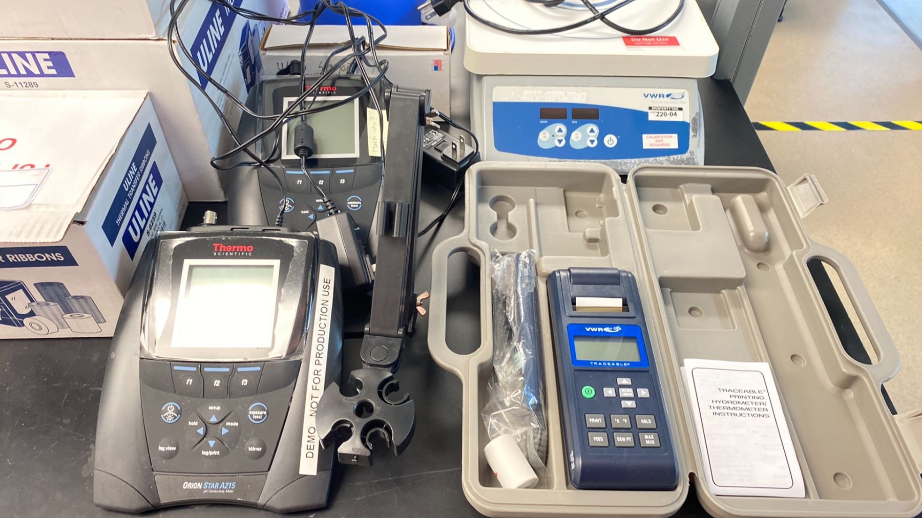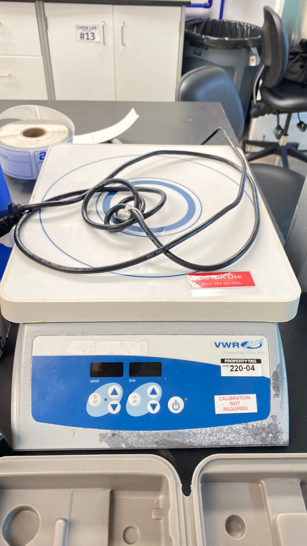 LOT OF ASSORTED ITEMS; ULINE THERMAL TRANSFER LABLES, VWR TRACEABLE PRINTING HYGROMETER/ THERMOMETER, HIGH VOLUME STIRRER AND MORE