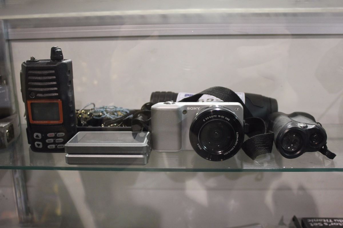 LOT OF ASSORTED JEWELRY, CAMERA, SCOPES