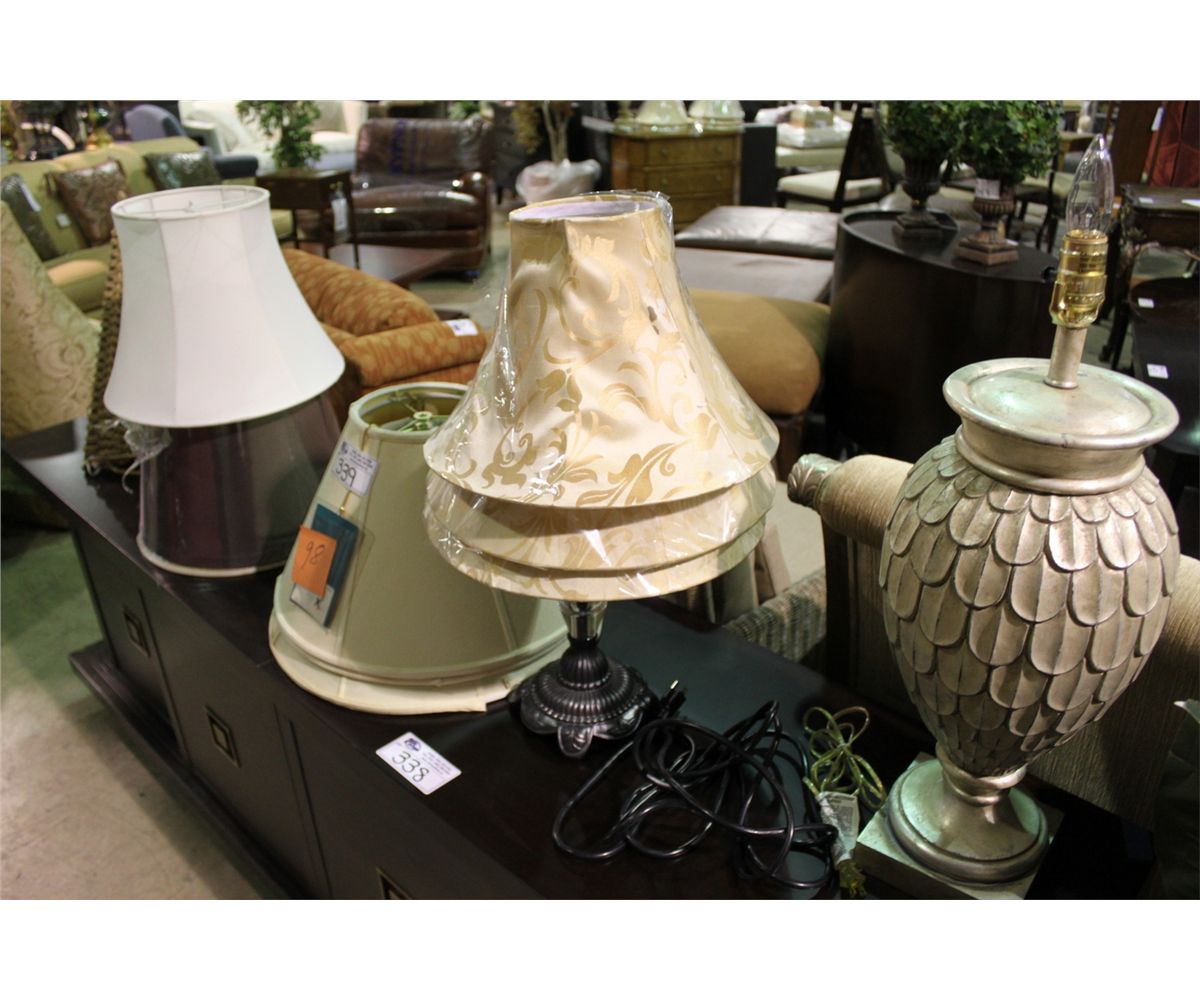 LOT OF ASSORTED LAMP SHADES, TABLE LAMPS & DECOR