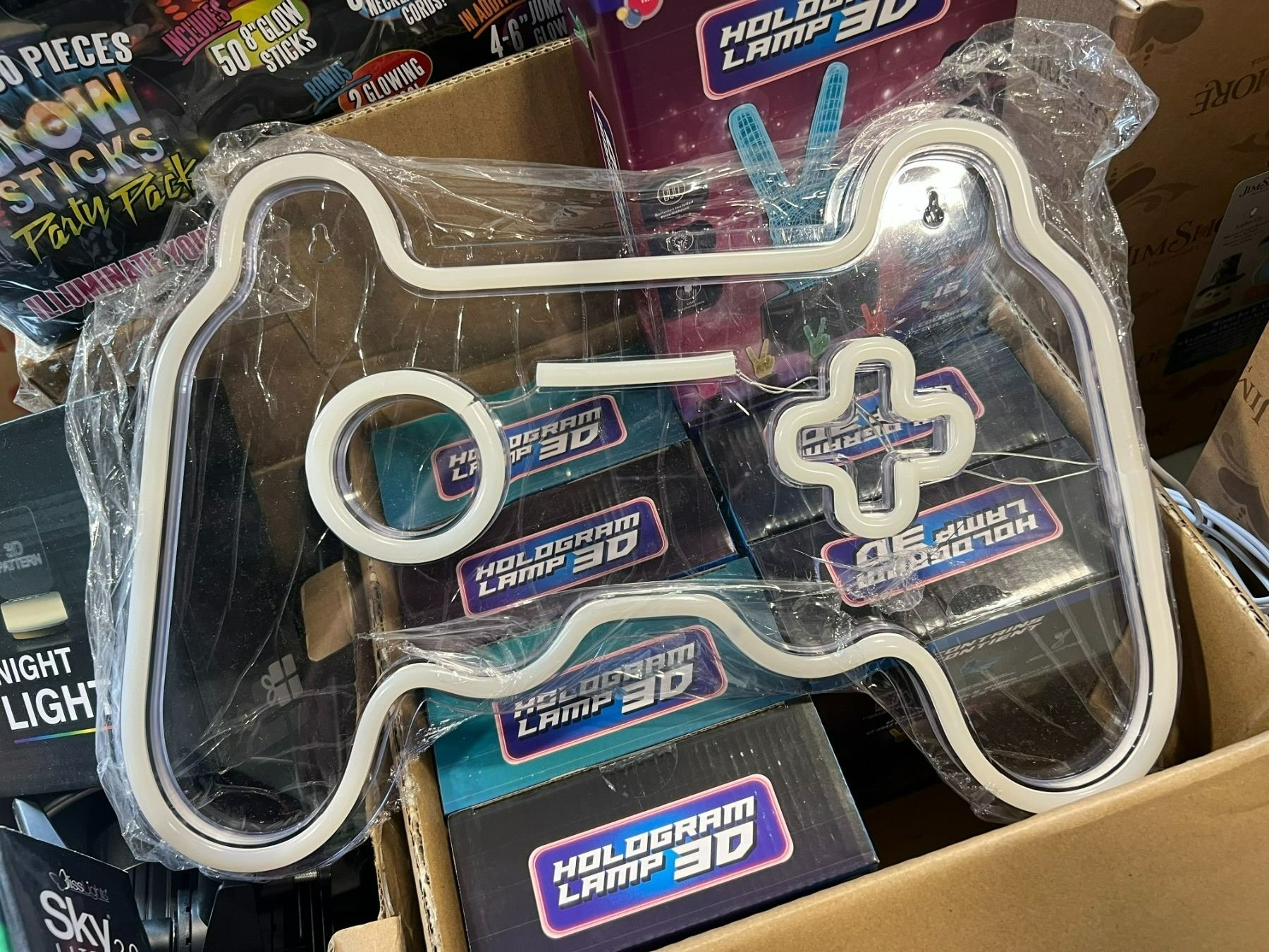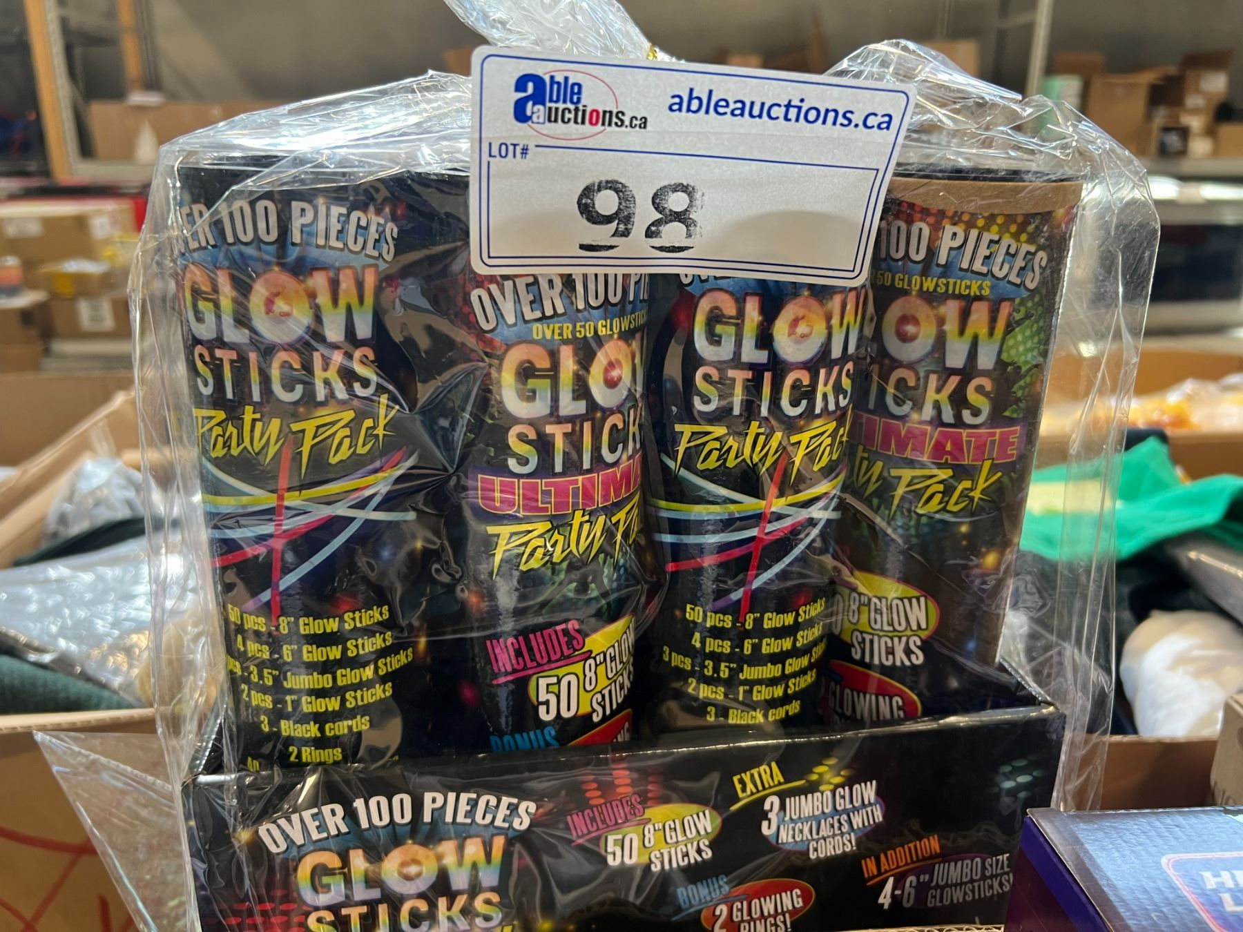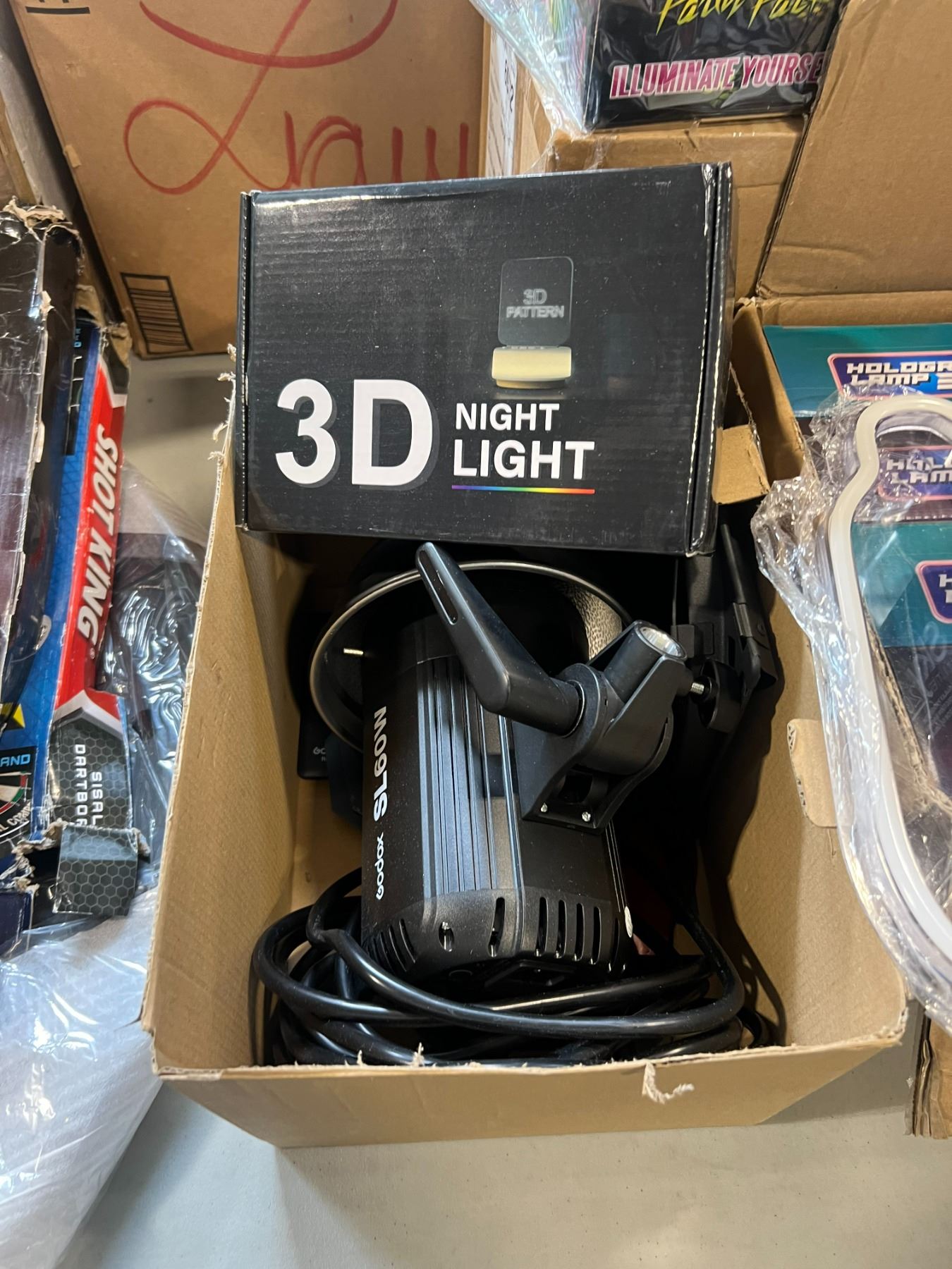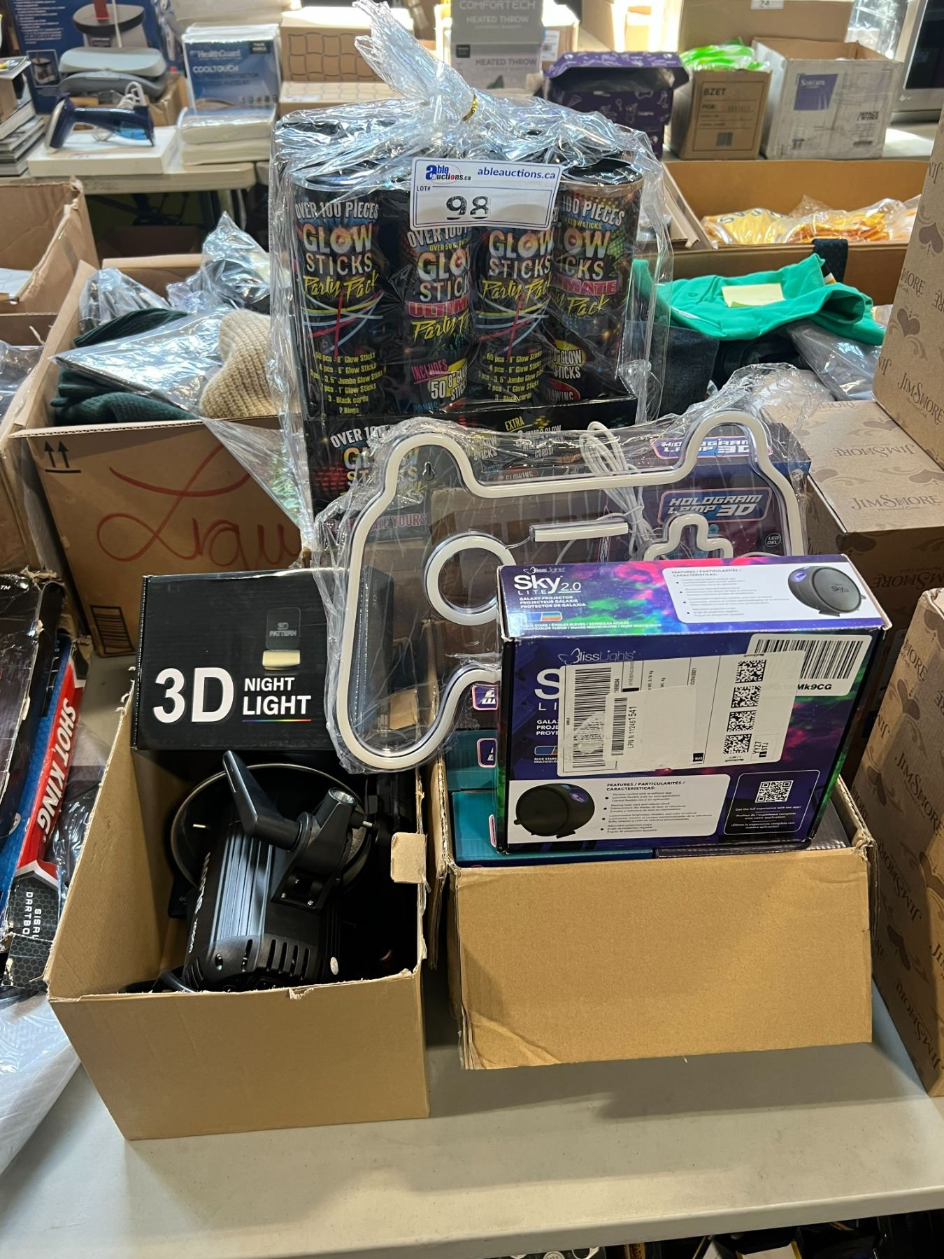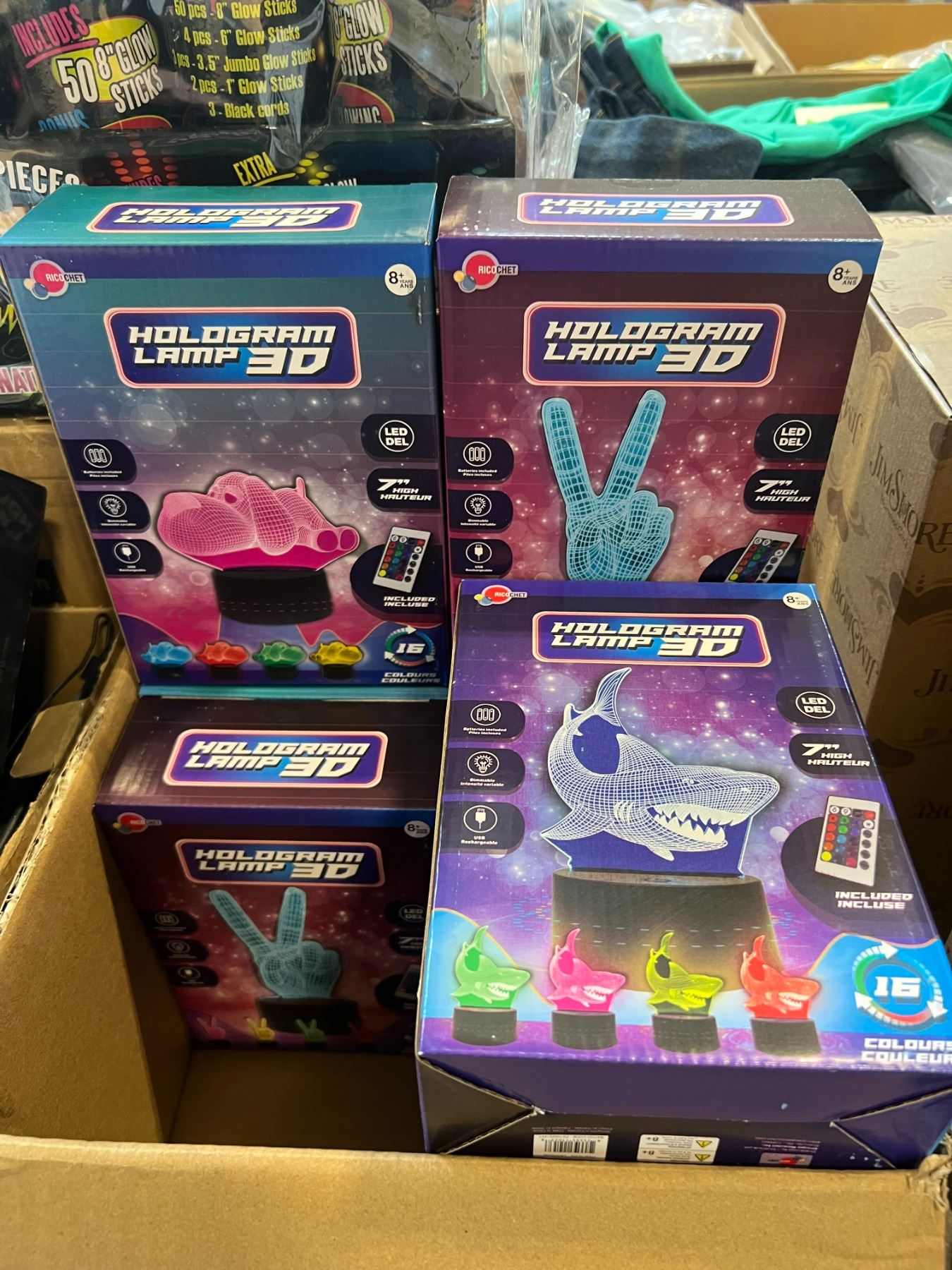 LOT OF ASSORTED LIGHTING INCLUDING GLOW STICKS, 3D HOLOGRAM LIGHTS, GALAXY PROJECTOR LIGHT AND COLORED WASH LIGHT