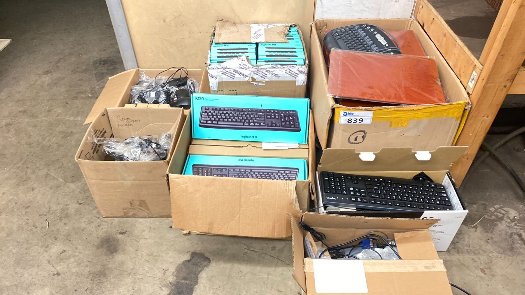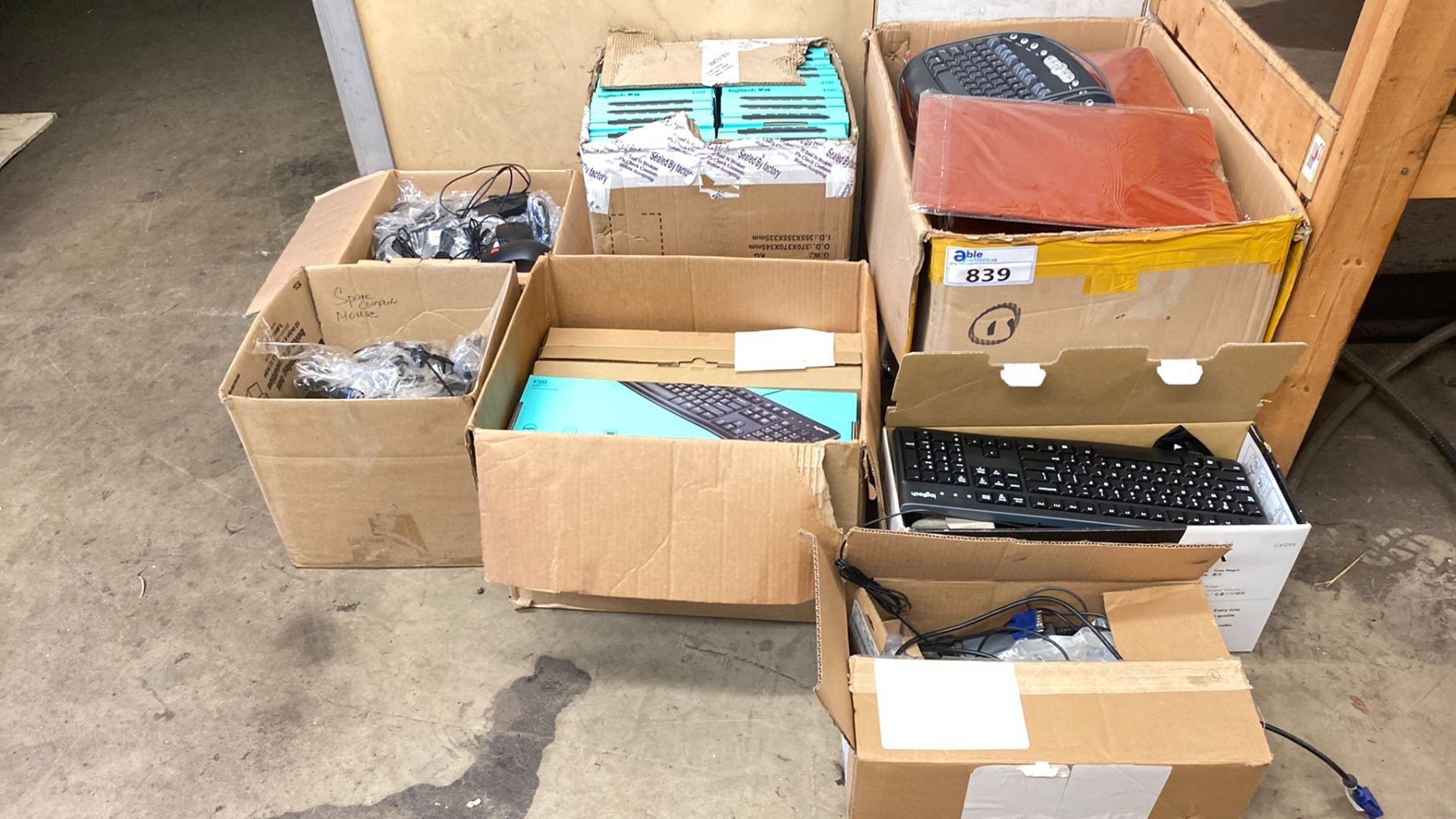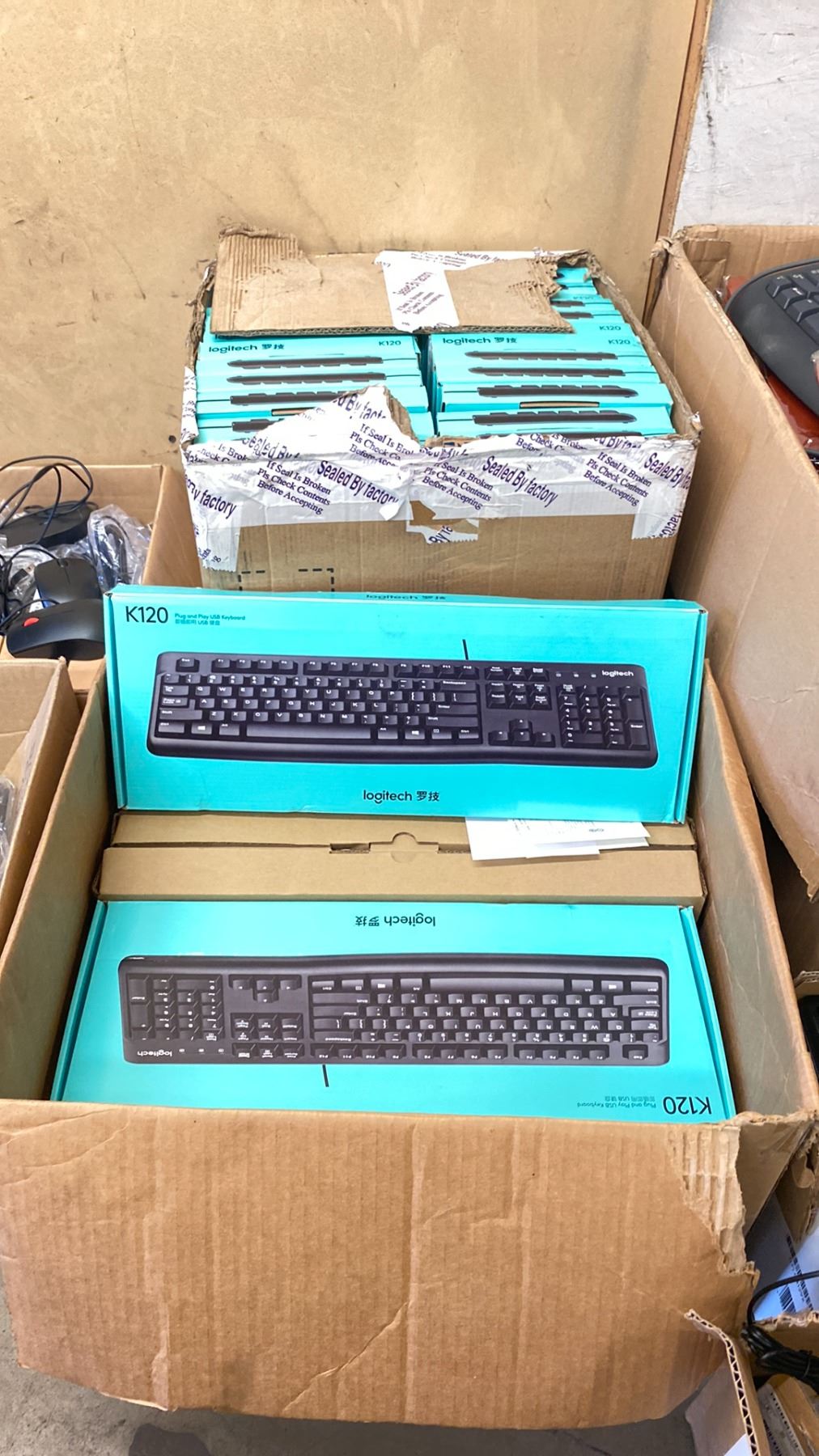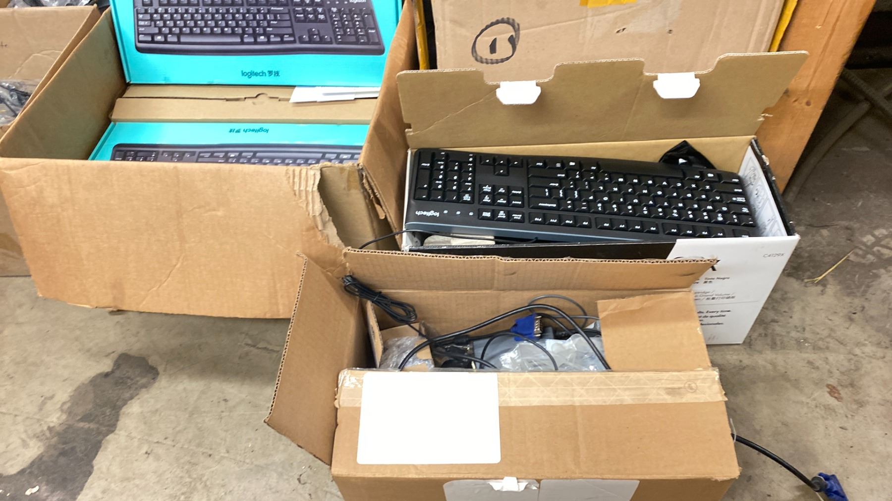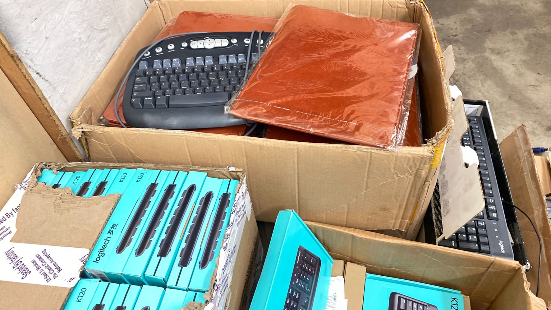 LOT OF ASSORTED LOGITECH KEYBOARDS + MICE & A BOX OF LAPTOP COVERS
