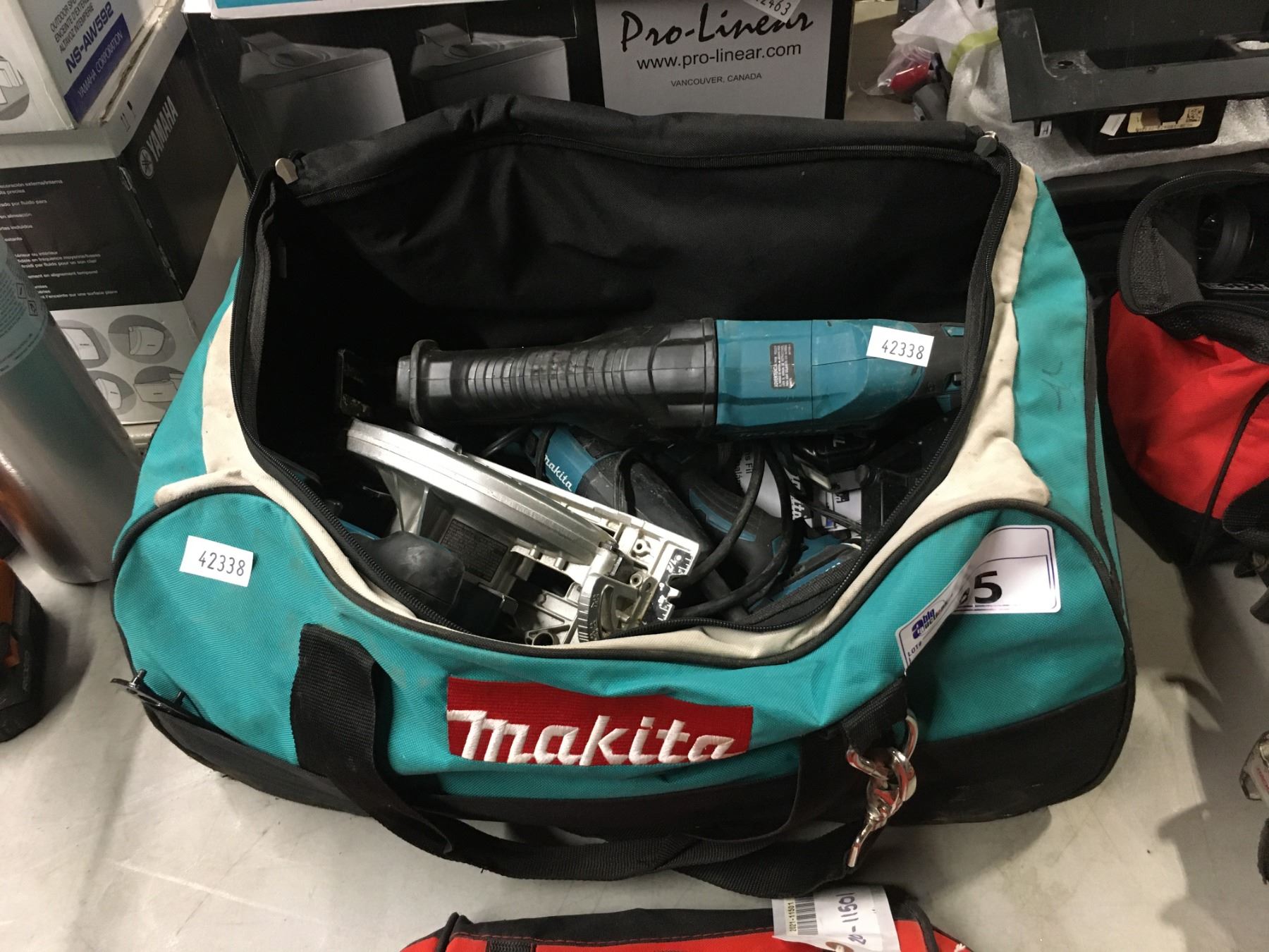 LOT OF ASSORTED MAKITA CORDLESS POWER TOOLS INCLUDING DRILL, IMPACT DRIVER, RECIPROCATING SAW, ANGLE GRINDER, 6-1/2" CIRCULAR SAW, 2 BATTERIES, CHARGER AND TOOL BAG