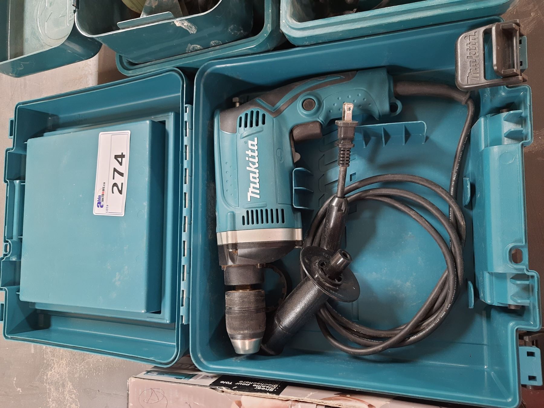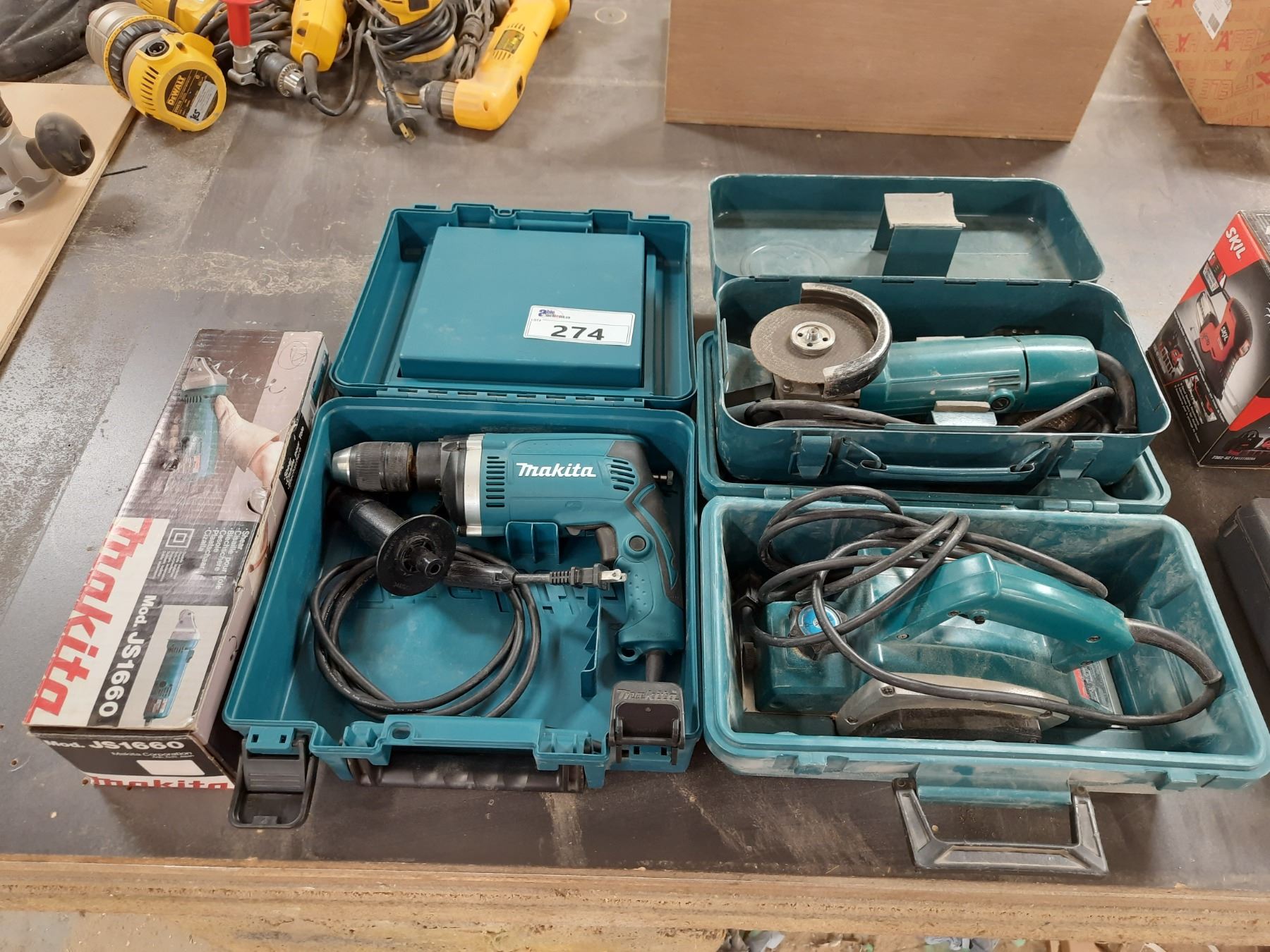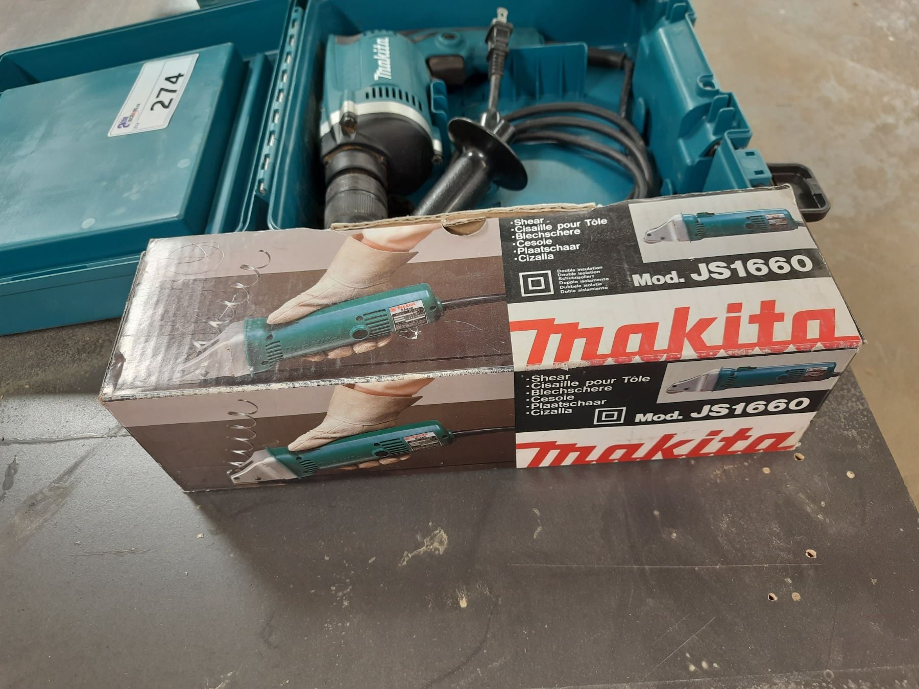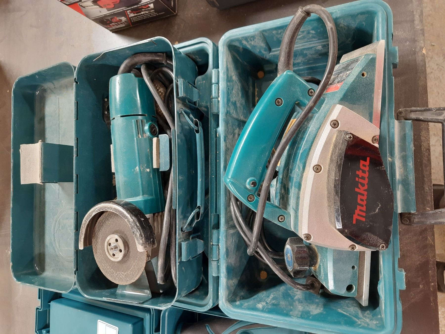 LOT OF ASSORTED MAKITA ELECTRIC POWER TOOLS INCLUDING BELT SANDER, ANGLE GRINDER, HAMMER DRILL AND SHEAR WITH 3 CARRY CASES