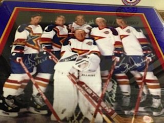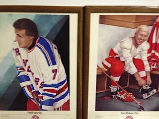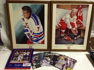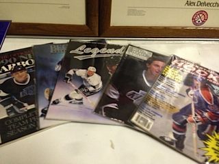 LOT OF ASSORTED MEMORABILIA INC: LARGE FRAMED PRINTS OF ALEX DELVECCHIO AND PHIL ESPOSITO, 5 GRETZKY COVER MAGAZINES AND SIGNATURE SERIES PHOTO SIGNED BY: STAN MAKITA, TED LINDSAY, ROD GILBERT AND FRANK MOHAVLICH