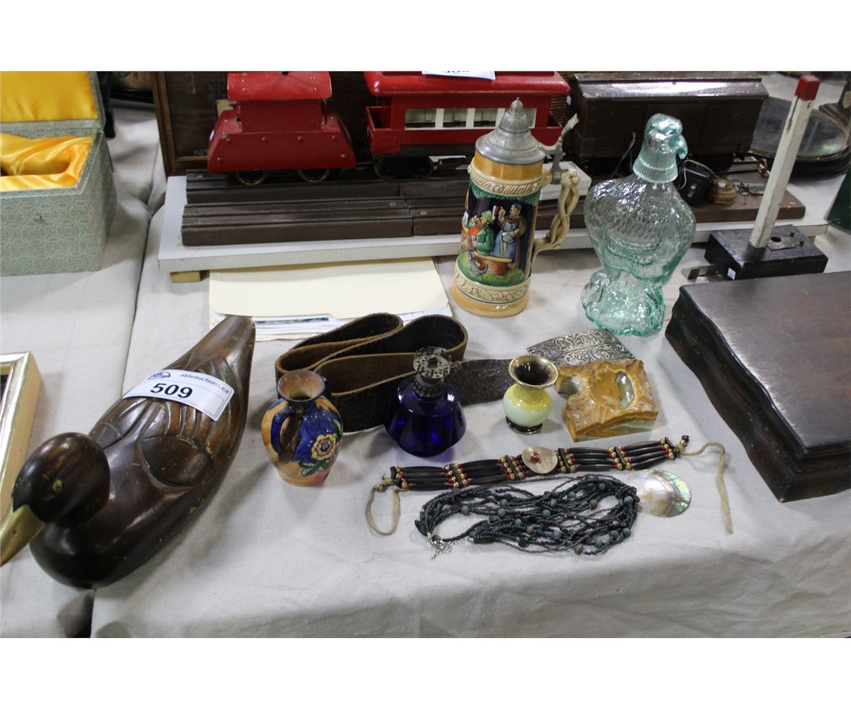 LOT OF ASSORTED MISC. INCL WOODEN DUCK, BEER STEIN, NATIVE NECKLACE AND MORE
