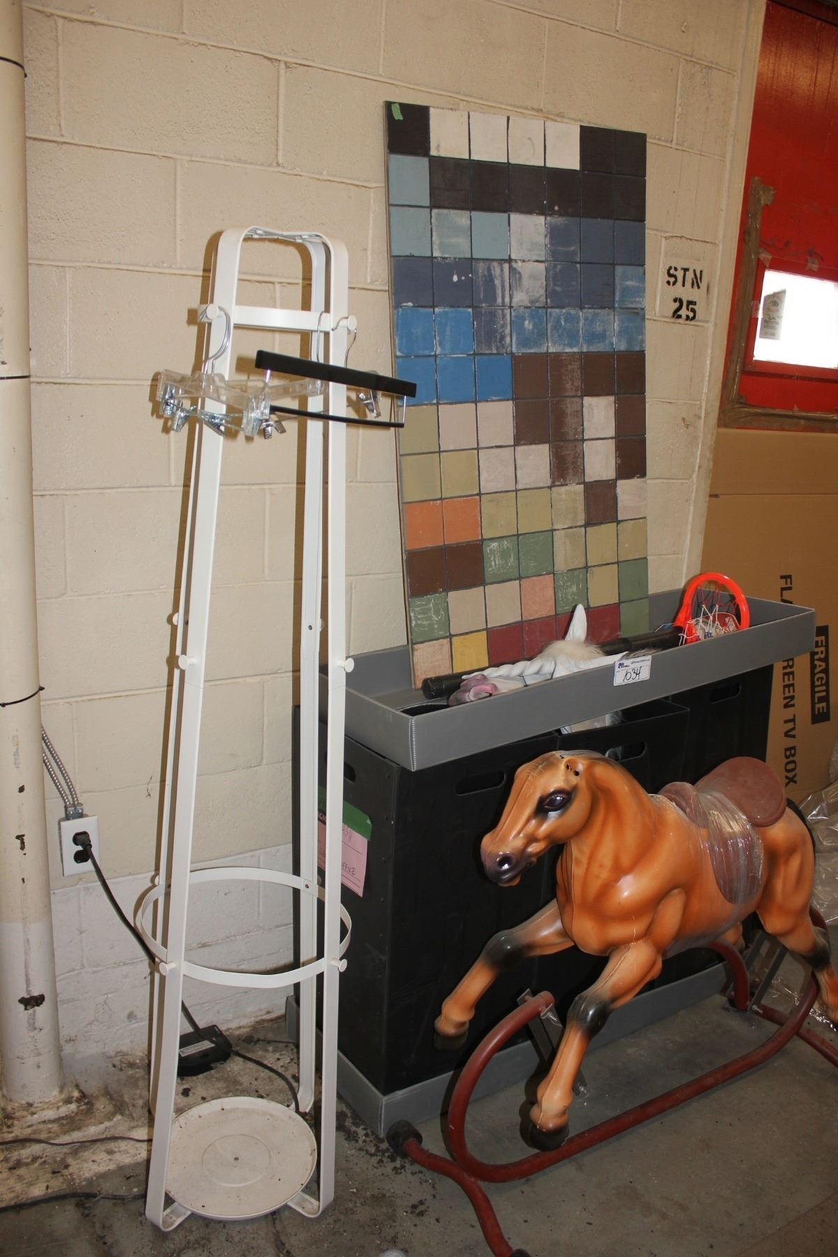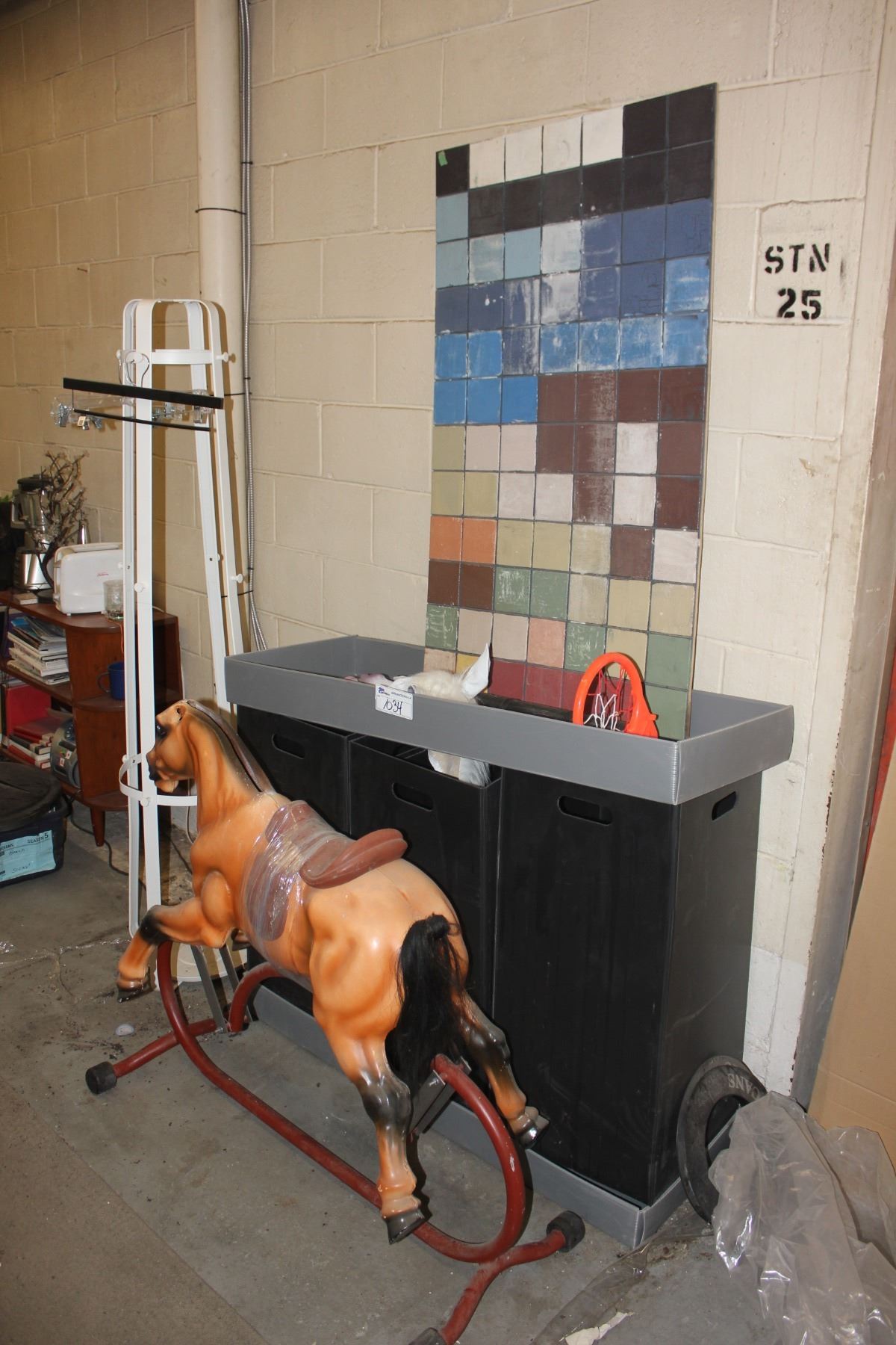 LOT OF ASSORTED MOVIE PROP ITEMS; ROCKING HORSE, COAT RACK, BINS AND MORE
