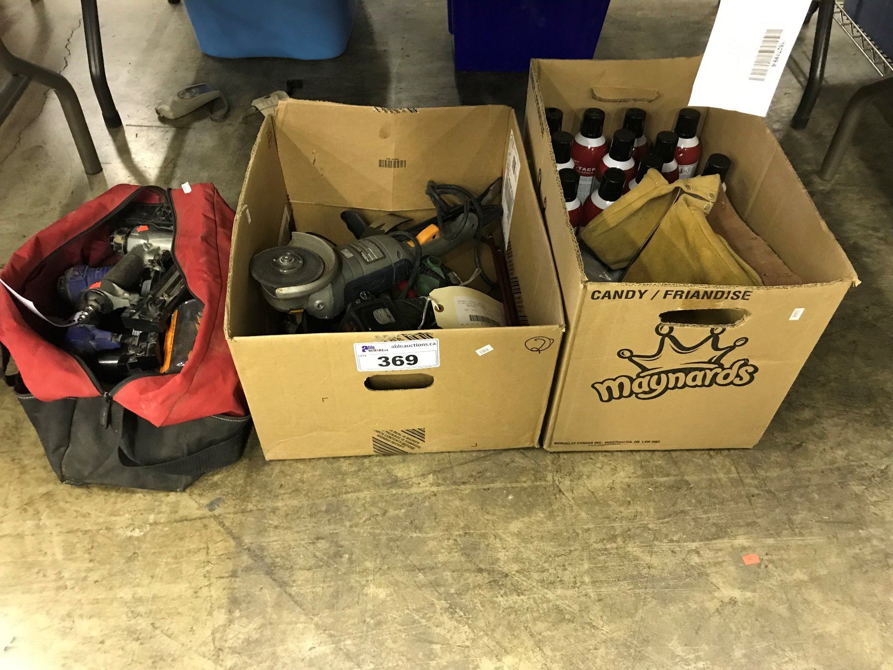 LOT OF ASSORTED POWER TOOLS, AIR NAILER, GRINDER, ROUTER BITS & MORE