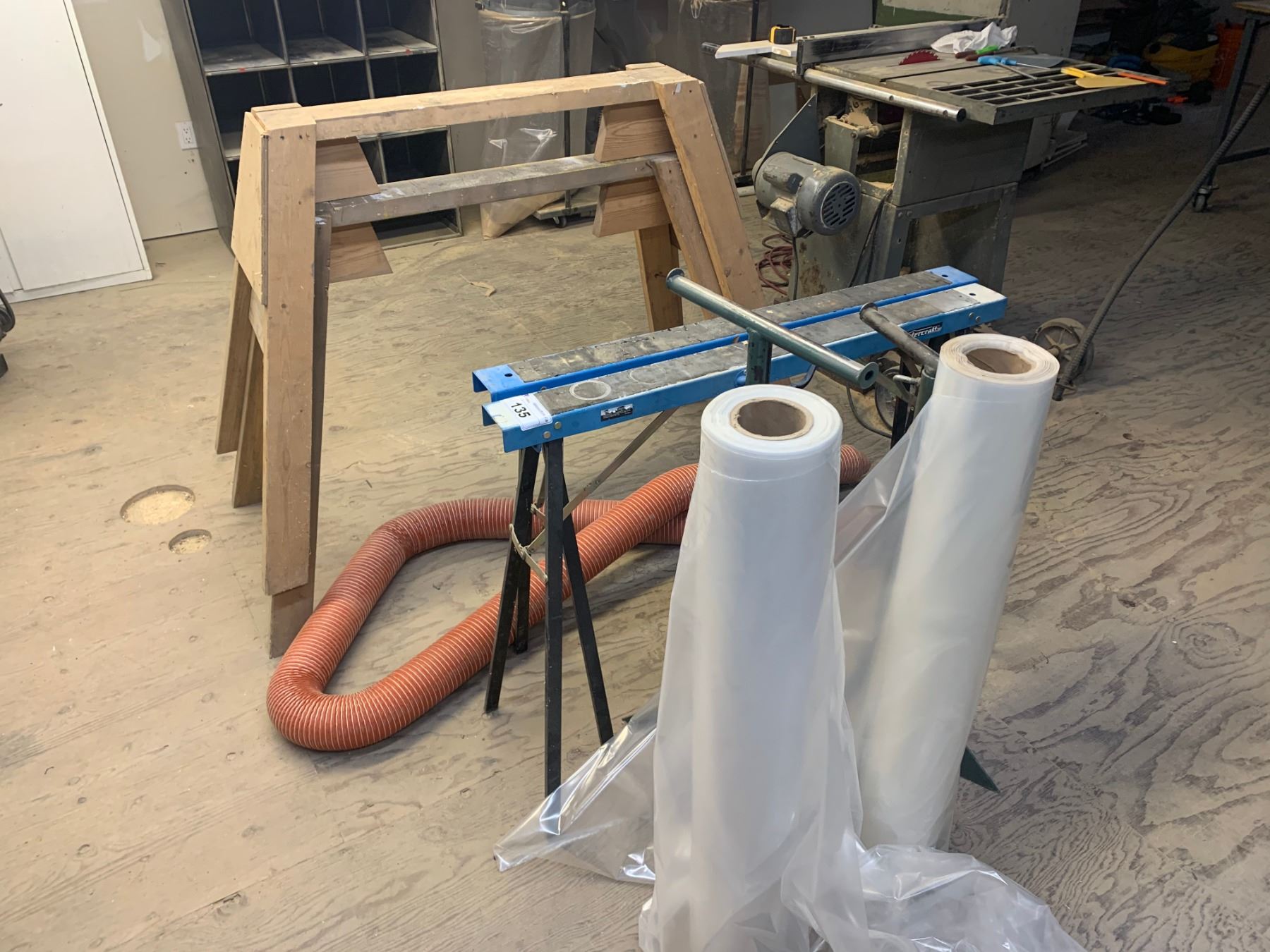 LOT OF ASSORTED SAW HORSES, 2 ROLLS PLASTIC BAGS, 2 ROLLER STANDS & ORANGE VENT HOSE