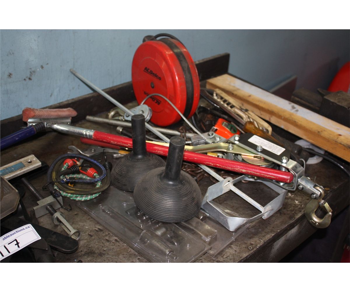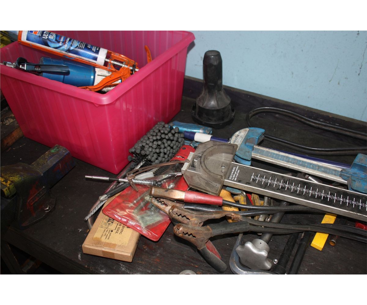 LOT OF ASSORTED SHOP TOOLS ON TOP OF BENCH