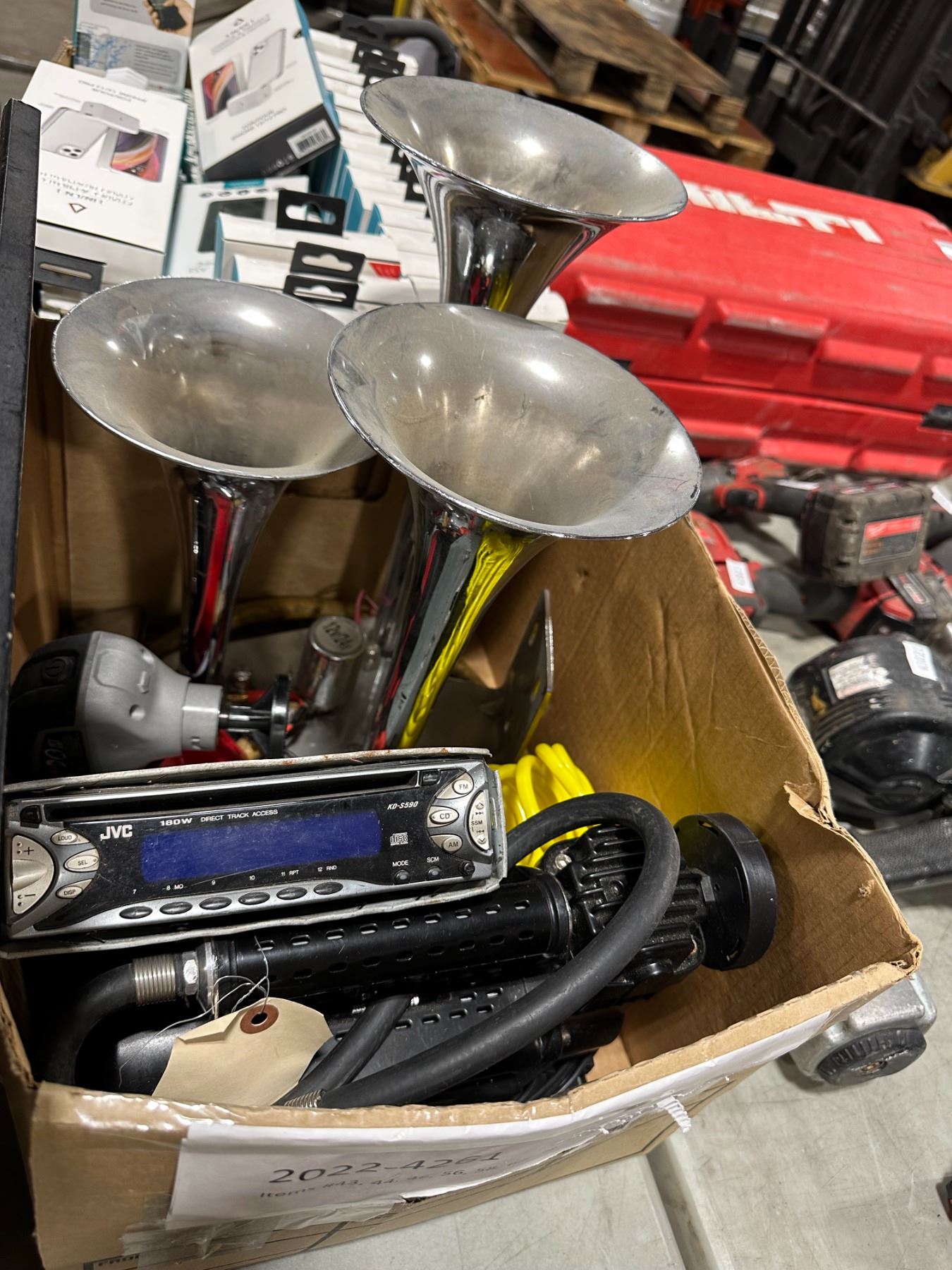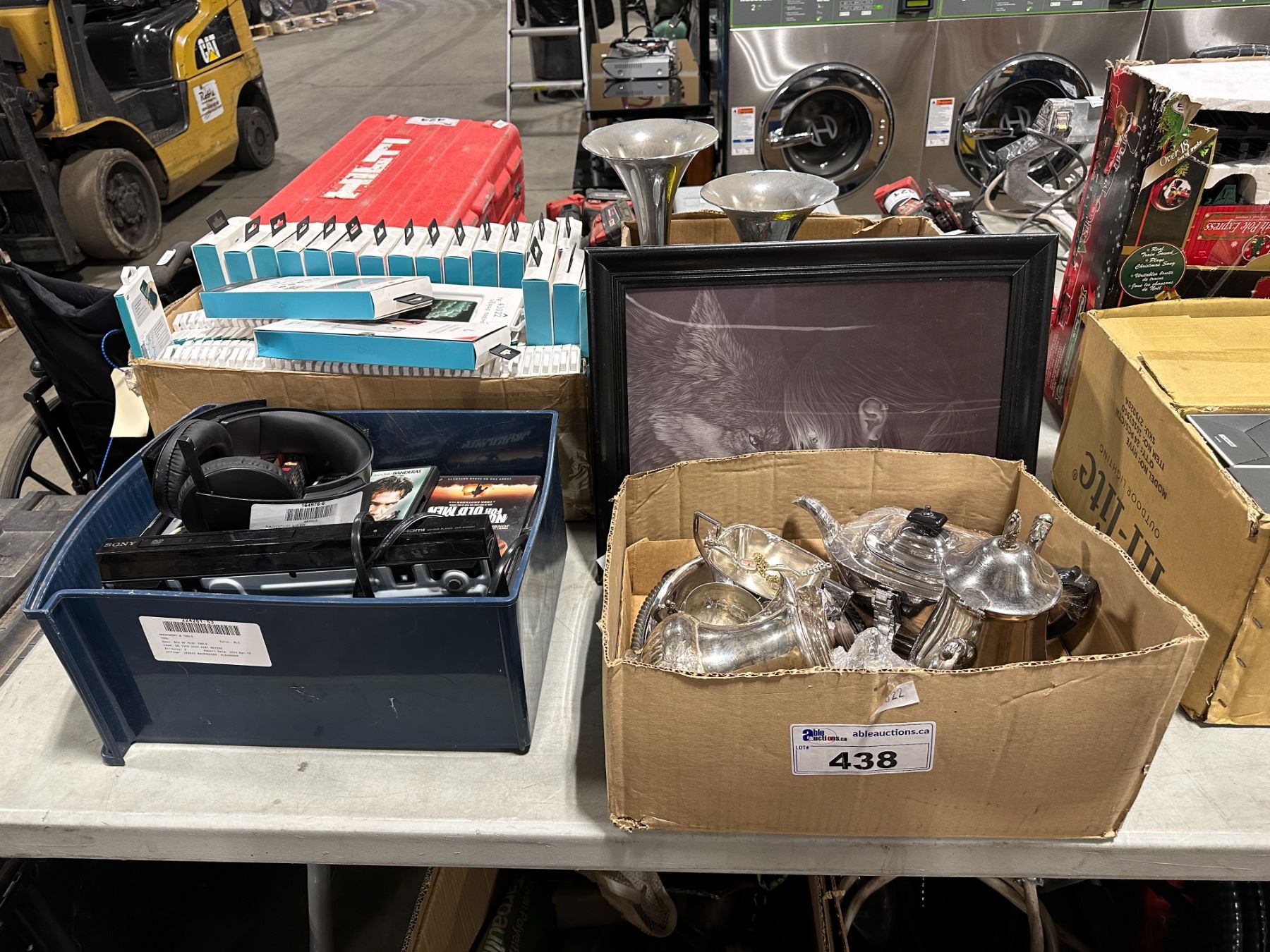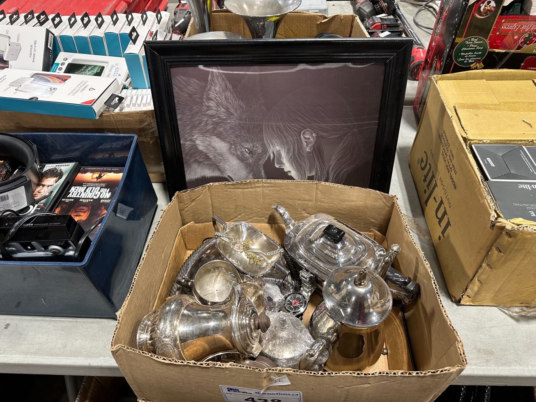 LOT OF ASSORTED SILVERWARE, BOX OF 3 IN 1 IPHONE 12 CHARGER/SCREEN PROTECTOR/CASE, BOX OF ASSORTED DVD'S WITH SONY DVD PLAYER, TRUCK HORN AND 3D PICTURE
