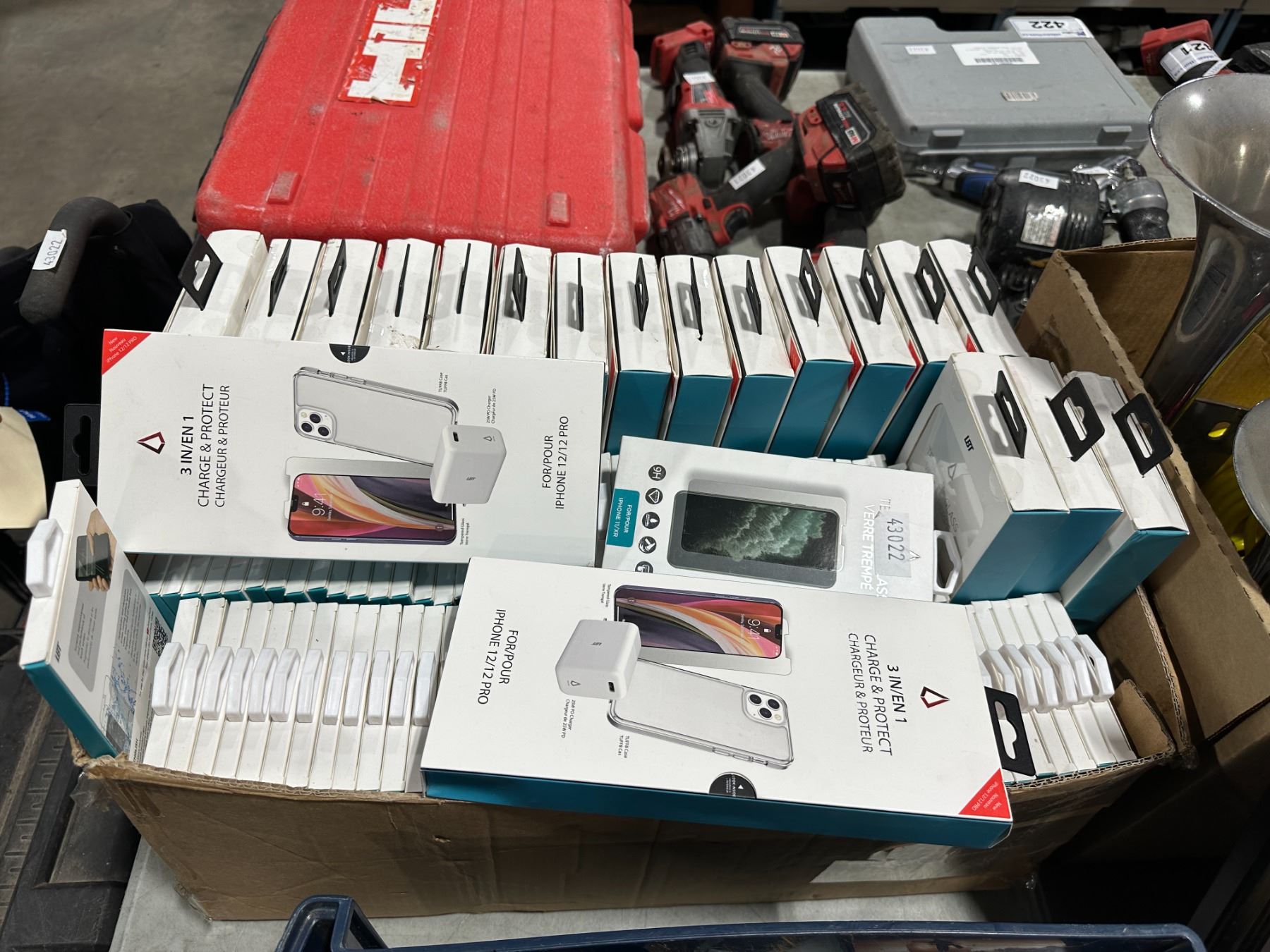 LOT OF ASSORTED SILVERWARE, BOX OF 3 IN 1 IPHONE 12 CHARGER/SCREEN PROTECTOR/CASE, BOX OF ASSORTED