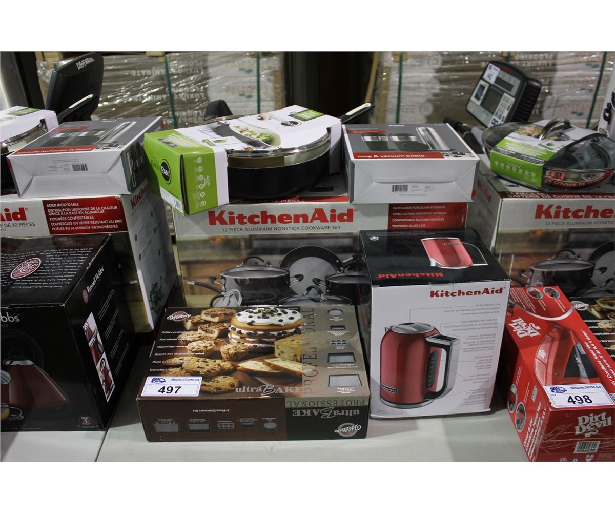 LOT OF ASSORTED SMALL APPLIANCES: 12 PIECE KITCHEN AID COOKWARE SET, 5 PIECE BAKEWARE SET, GREEN PAN, TRAVEL MUG SET, AND KITCHEN AID KETTLE