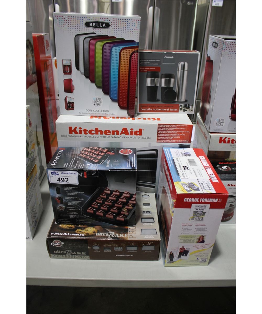 LOT OF ASSORTED SMALL APPLIANCES: KITCHEN AID TOASTER OVEN, BELLA COFFEE MAKER, GEORGE FORMAN GRILL, 5 PIECE BAKEWARE SET, REMINGTON CERAMIC CURLERS AND TRAVEL MUG SET