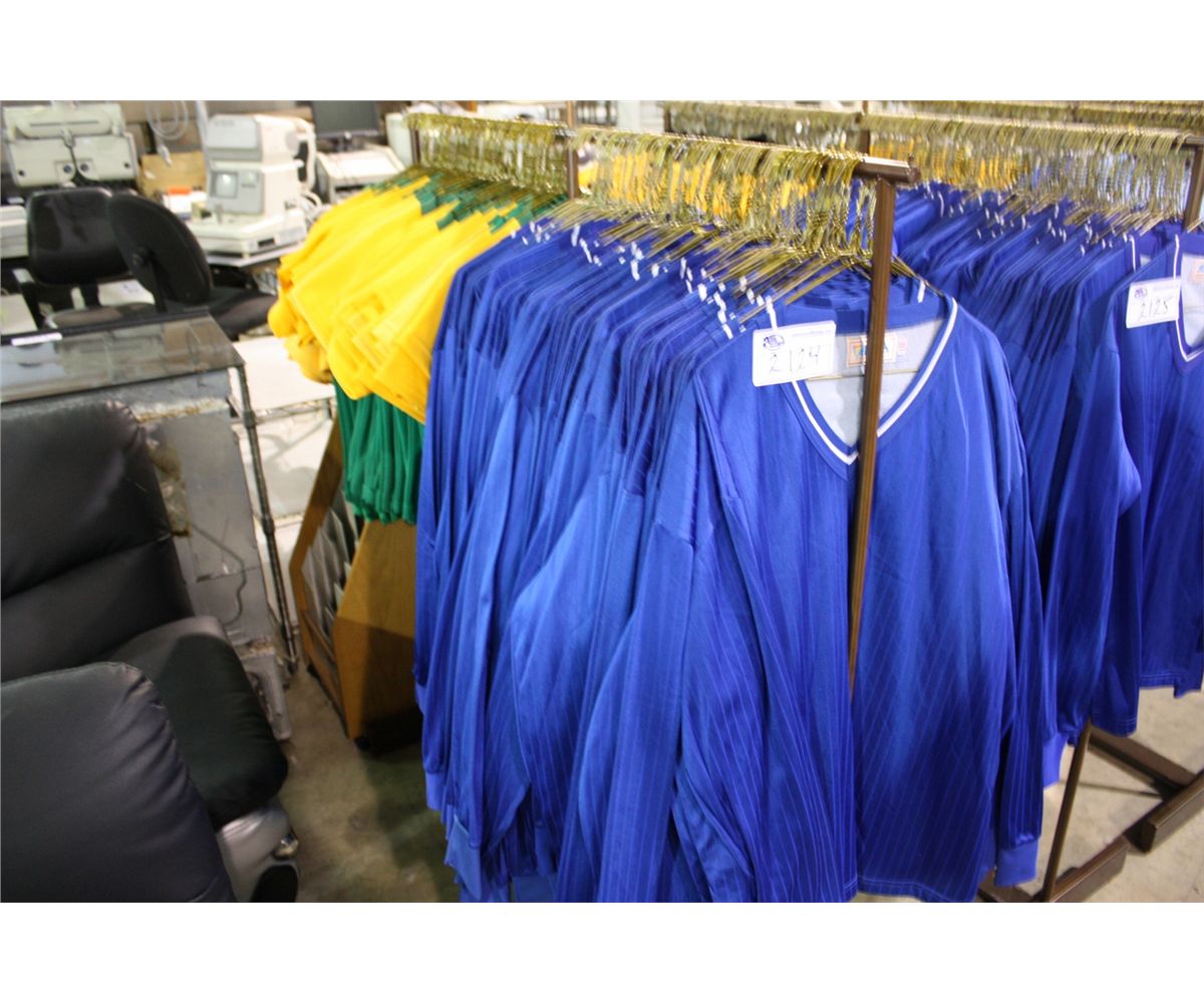 LOT OF ASSORTED SOCCER TEAM JERSEYS WITH RACK