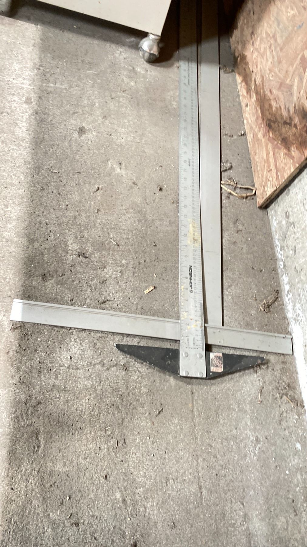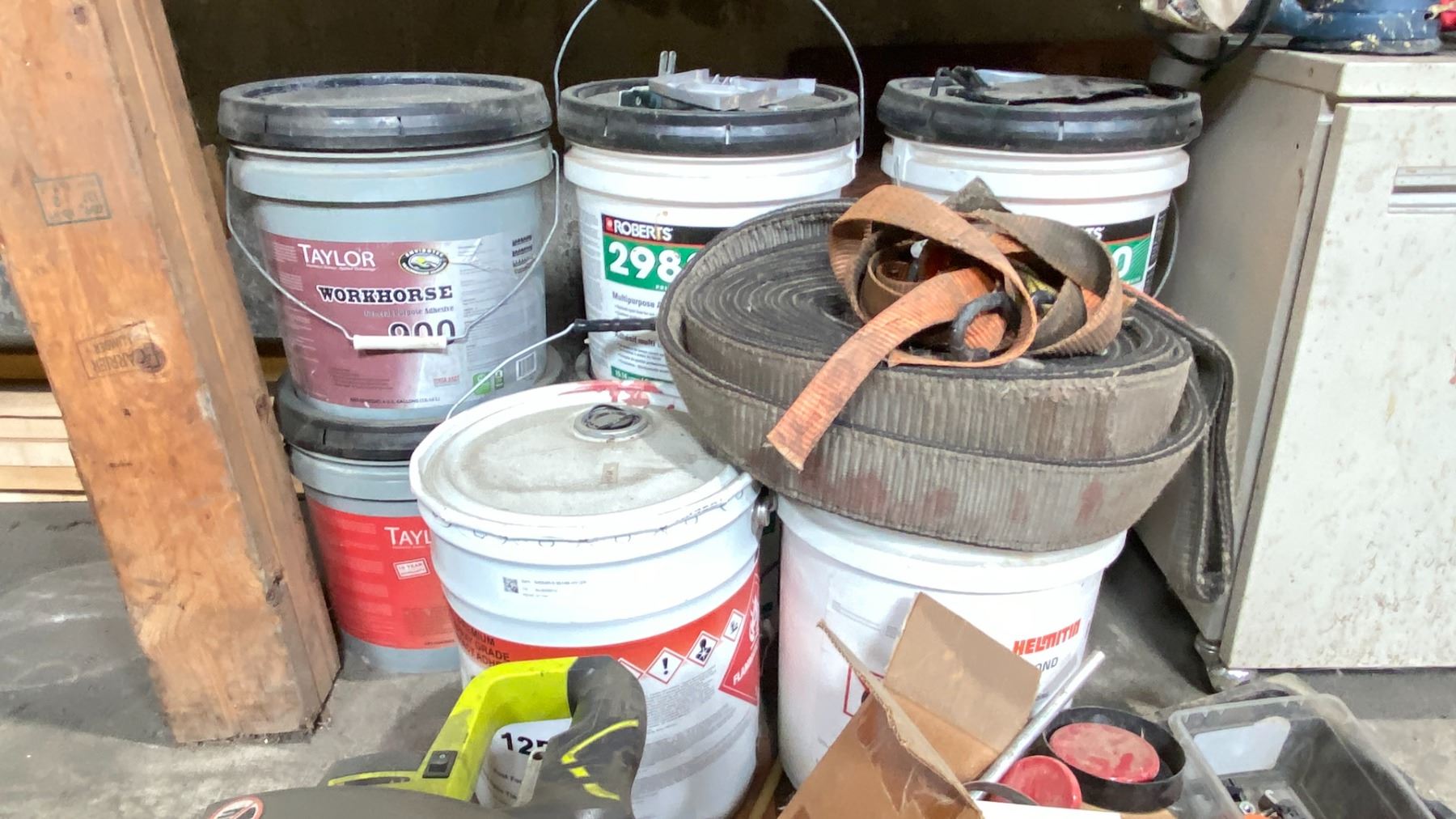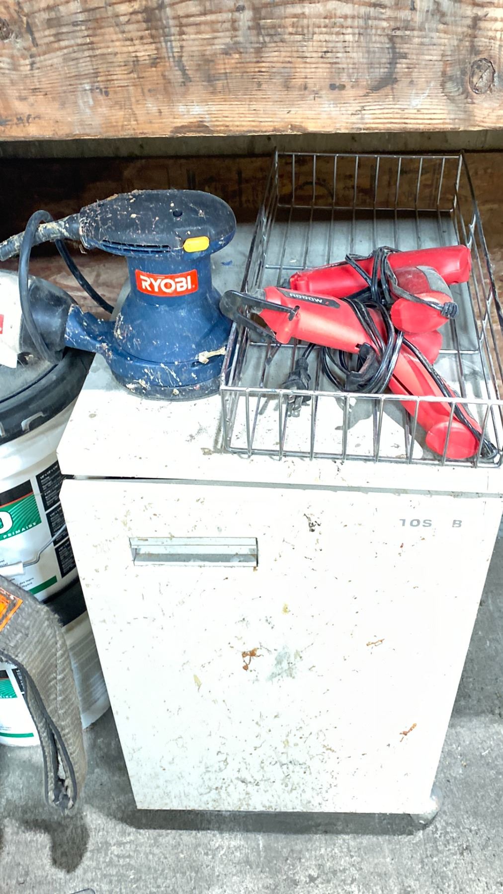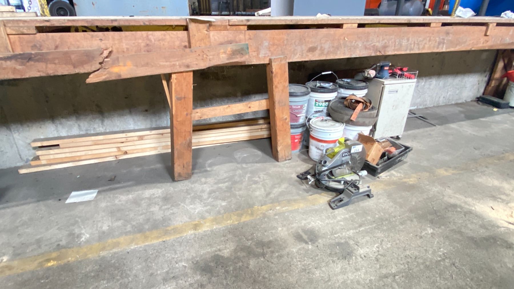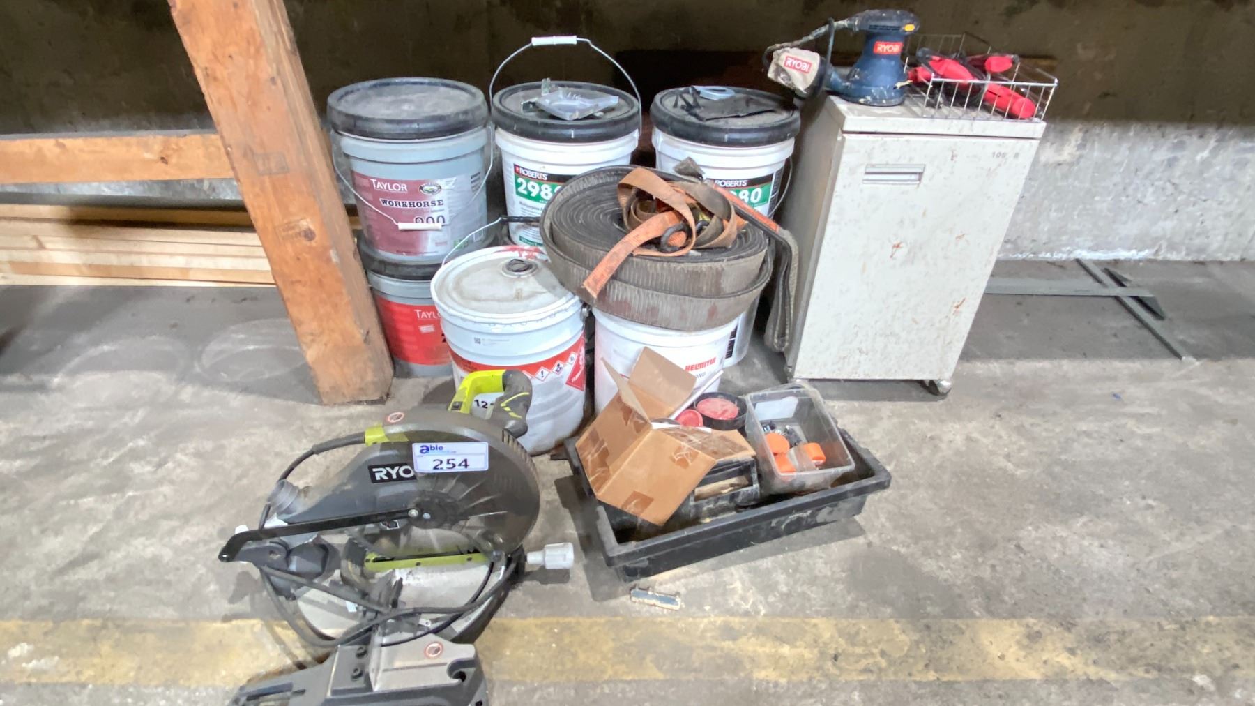 LOT OF ASSORTED SPRAY ADHESIVE, RYOBI CHOP SAW, ELECTRIC RYOBI SANDER, ASSORTED LONG LUMBER, LIFTING STRAP, SMALL METAL ROLLING CABINET & MORE