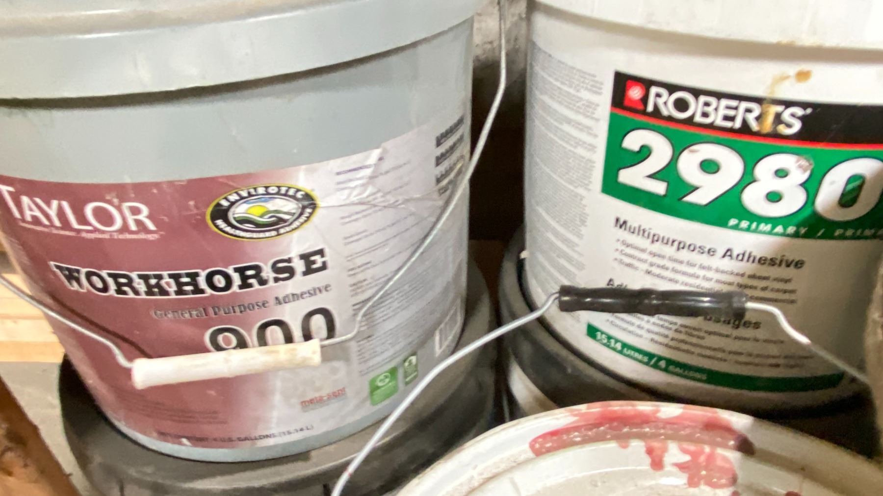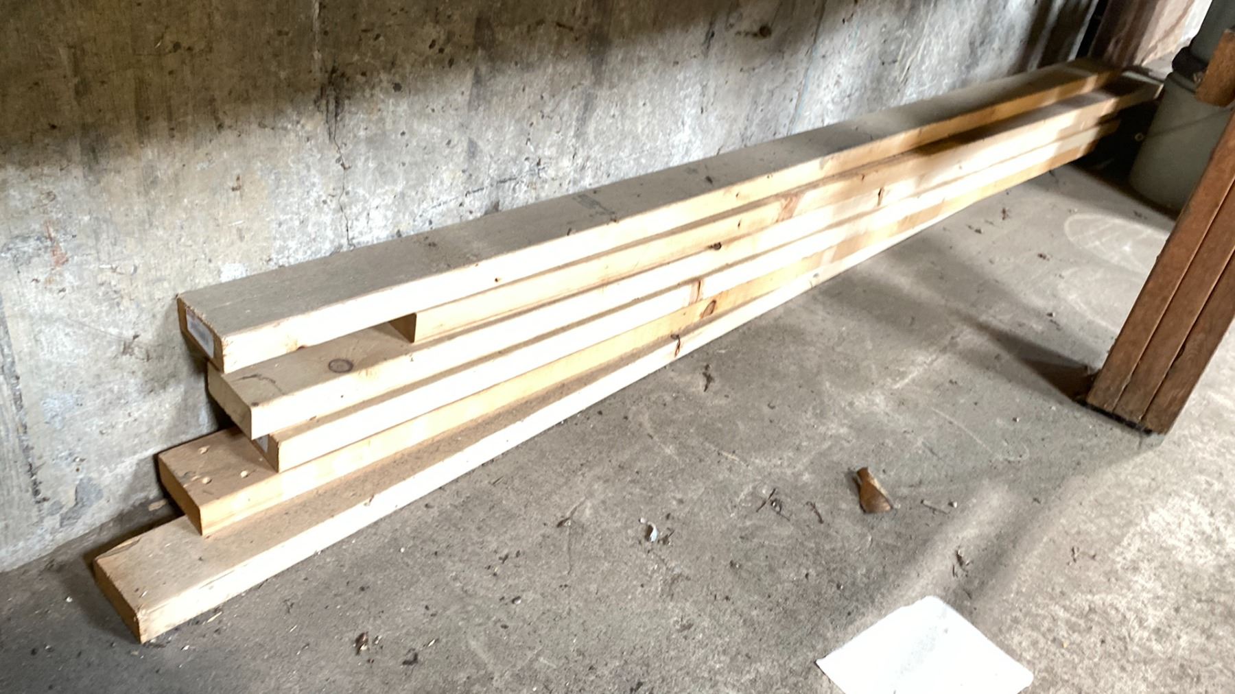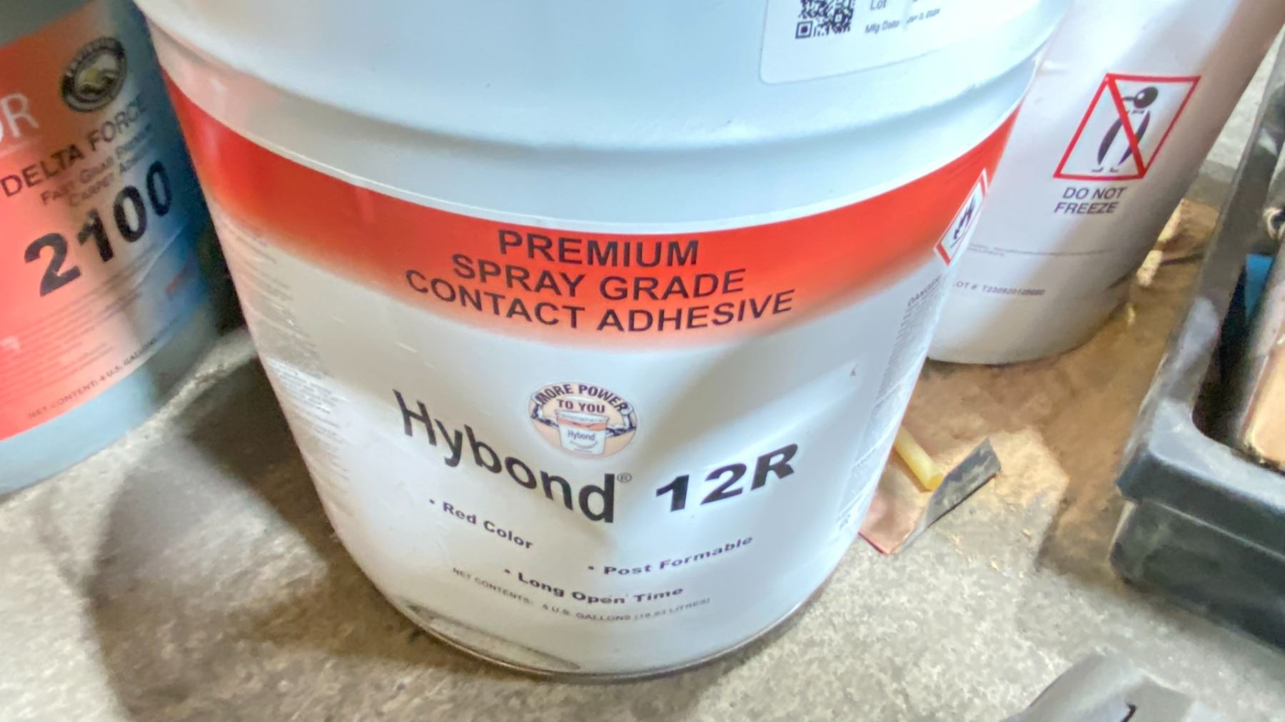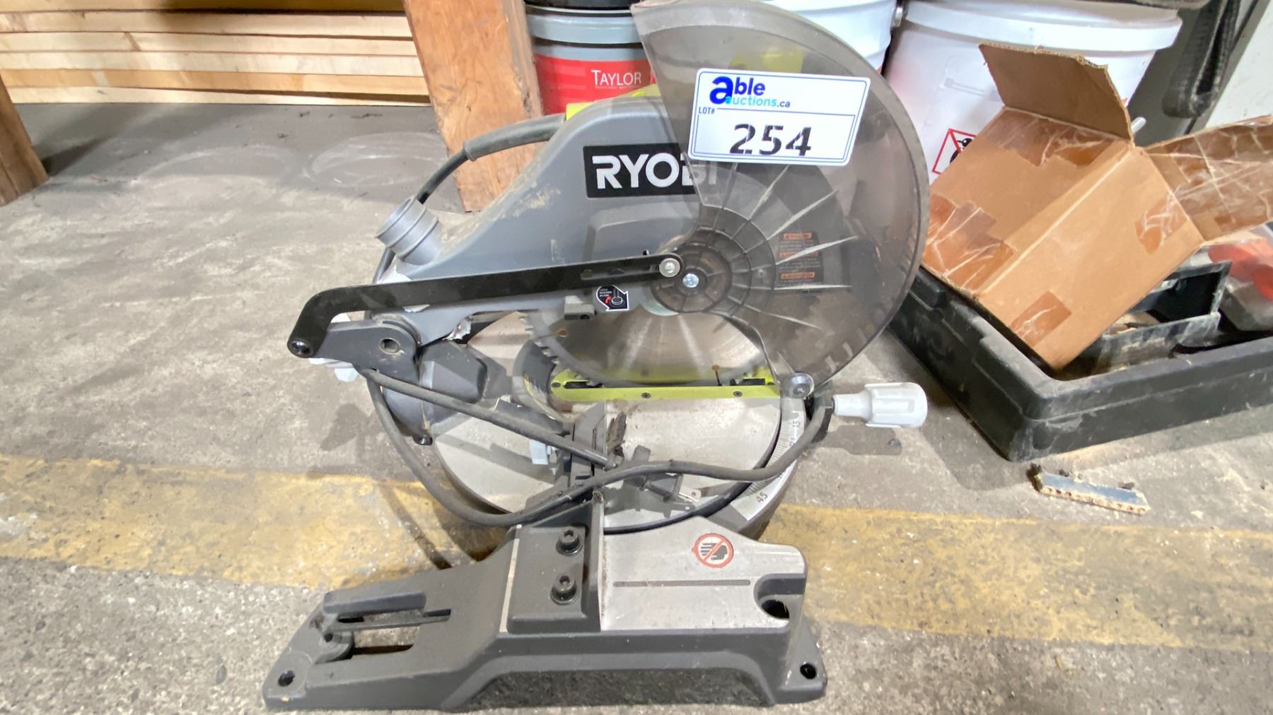 LOT OF ASSORTED SPRAY ADHESIVE, RYOBI CHOP SAW, ELECTRIC RYOBI SANDER, ASSORTED LONG LUMBER,