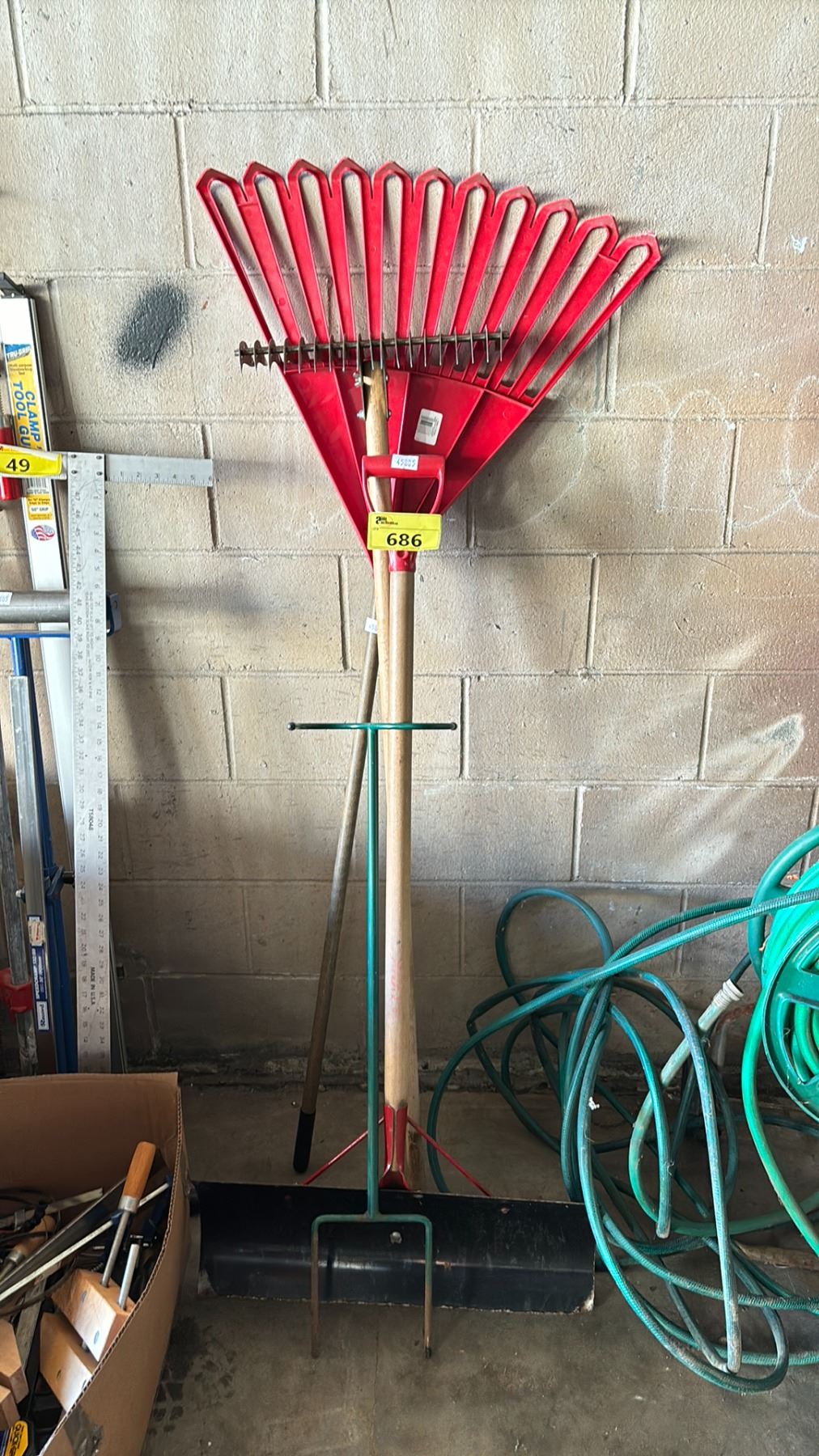 LOT OF ASSORTED TOOLS INCLUDING; METAL SHOVEL, WEED PULLER, RAKE & MORE
