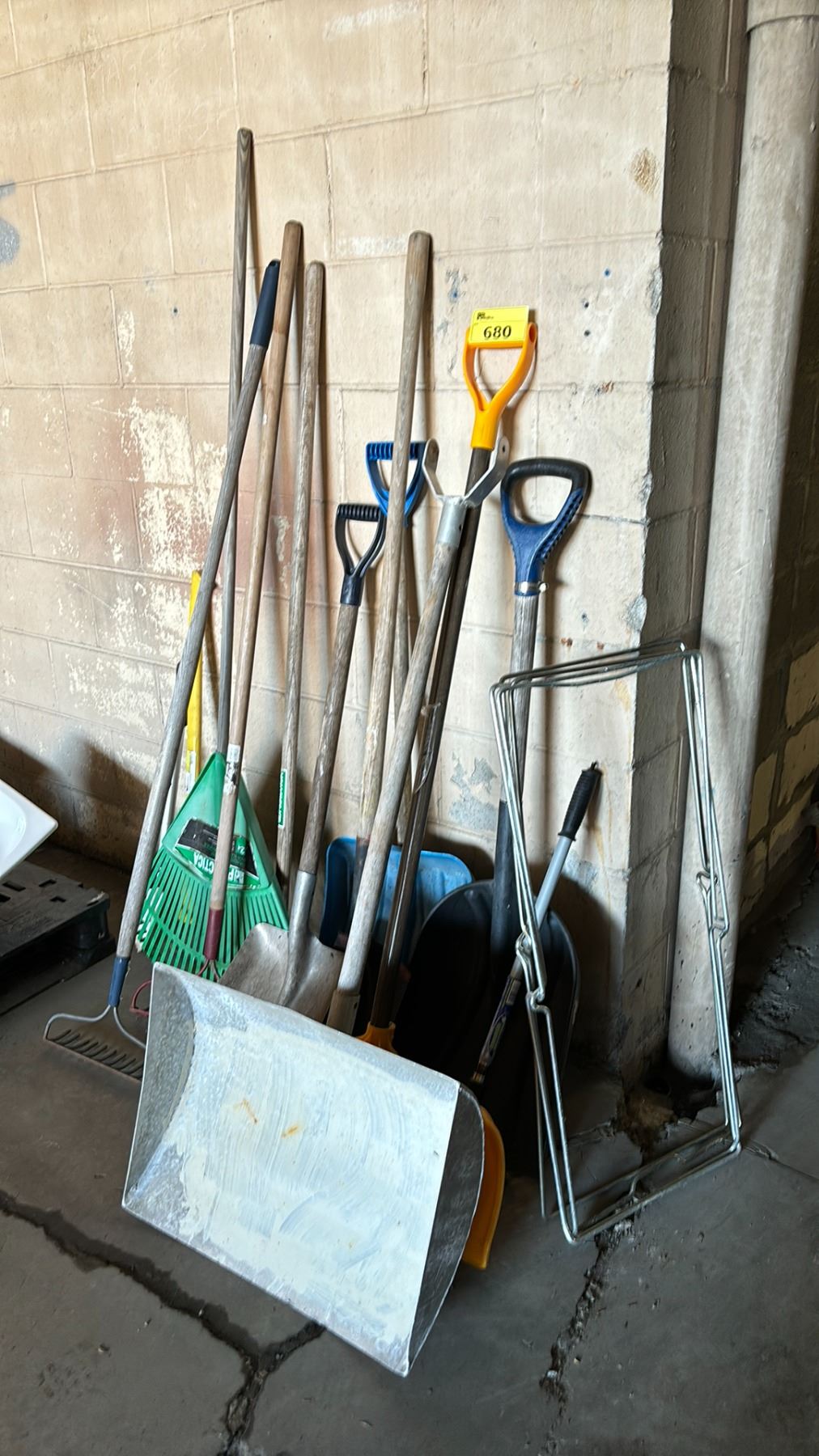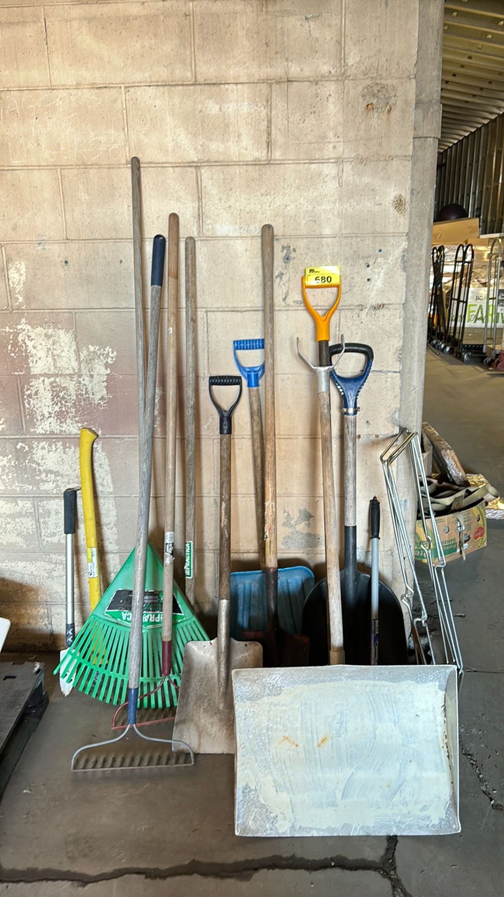 LOT OF ASSORTED TOOLS INCLUDING; SHOVELS, RAKES, FIRE AXE & MORE
