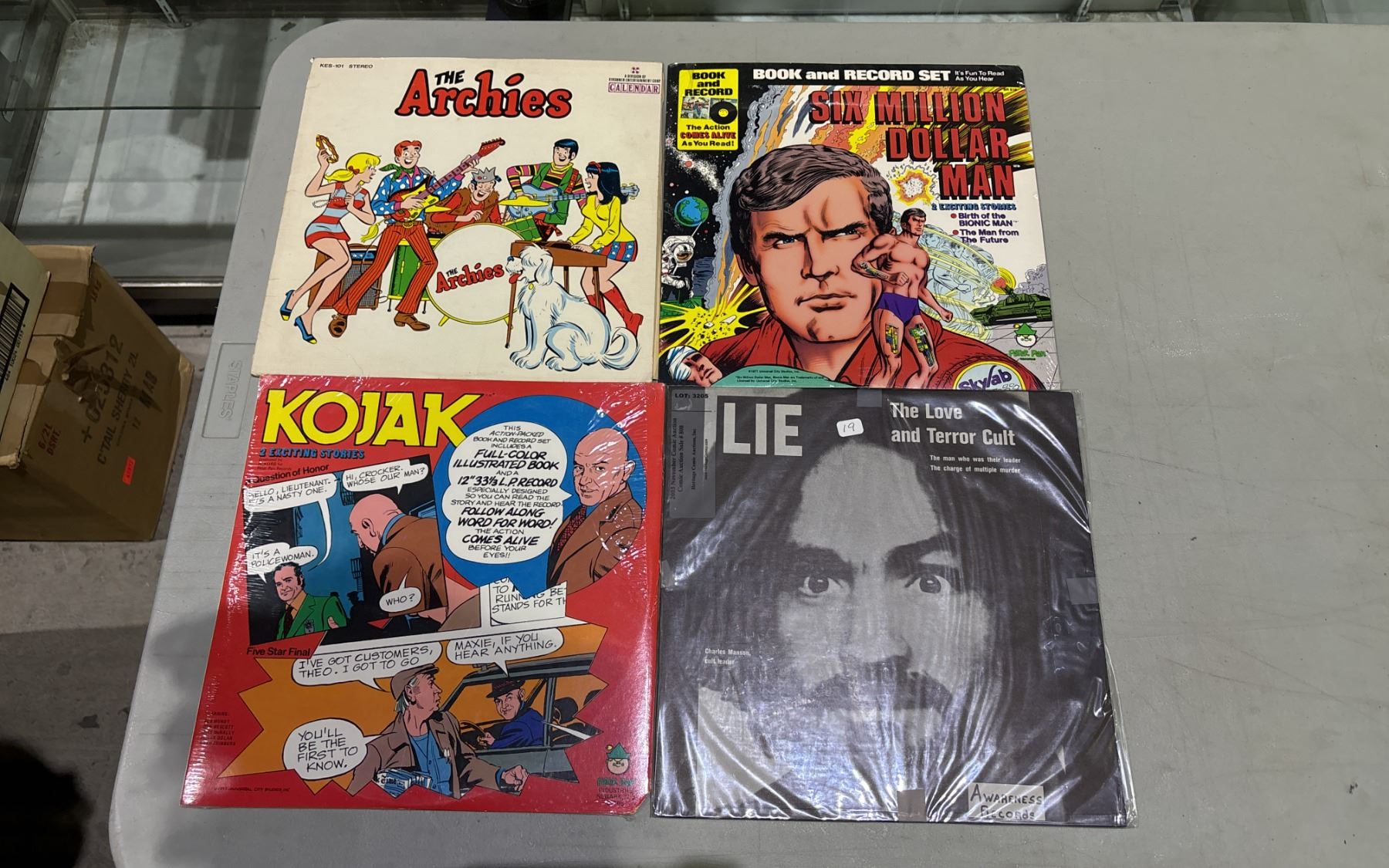 LOT OF ASSORTED VINYL RECORDS INCLUDING; LIE CHARLES MANSON, KOJAK, THE ARCHIES & SIX MILLION DOLLAR MAN